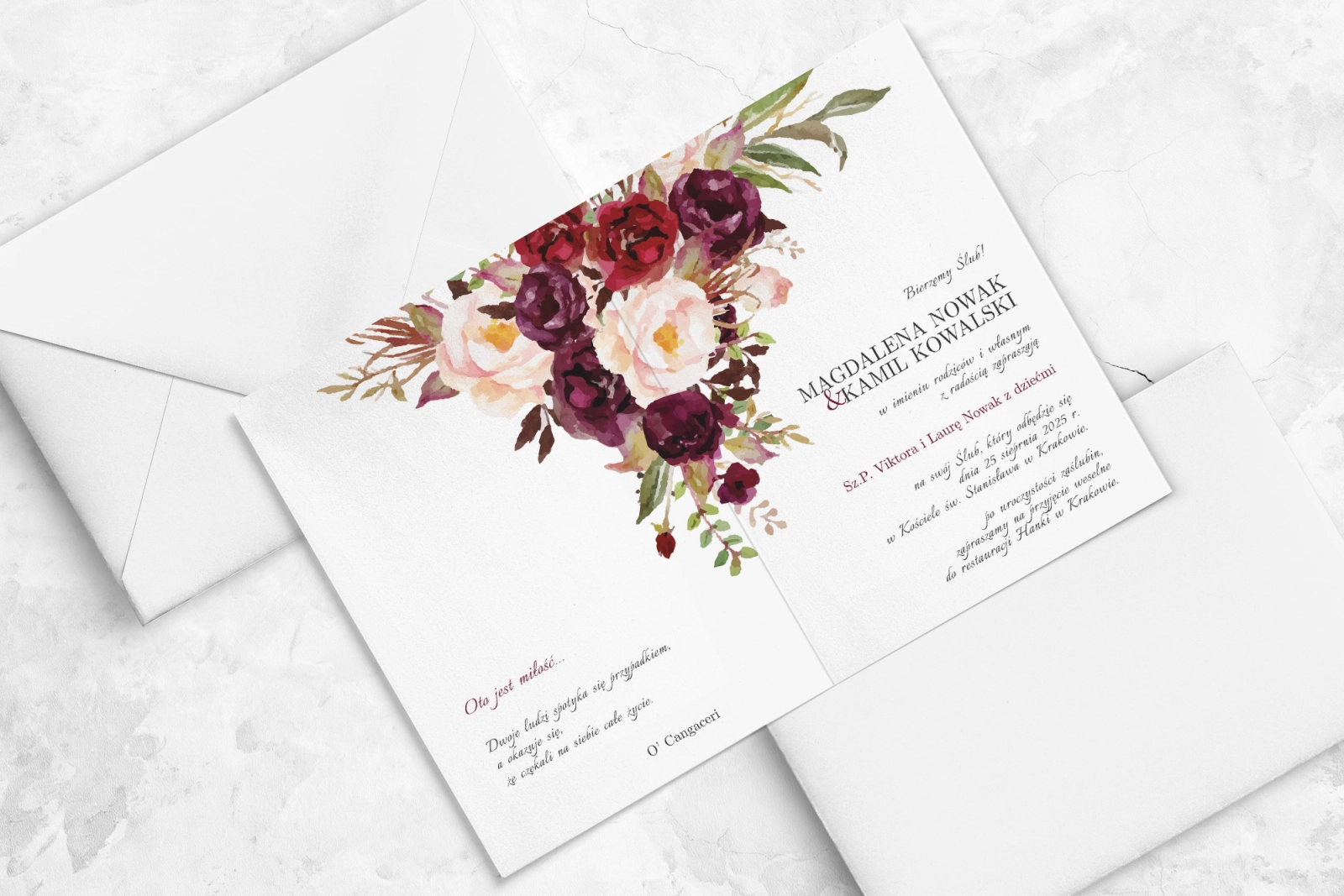 Oryginalne motywy kwiatowe zawarte na zaproszeniach dodadzą zaproszeniu romantyzmu. Mocny kolor kwiatów podkreśli elegancję a delikatna zieleń liści ożywi całe zaproszenie. Intensywne bordowe kolory w połączeniu z bielą papieru tworzą piękny efekt końcowy.
