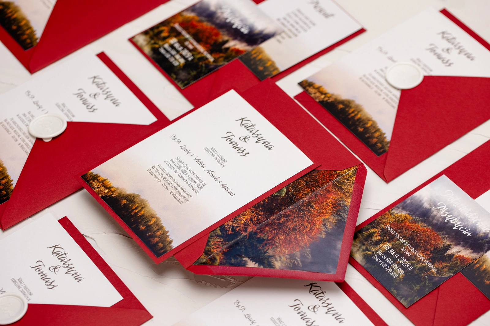 Leśne zaproszenie ze złotymi napisami i piękną dopasowaną kopertą bordową