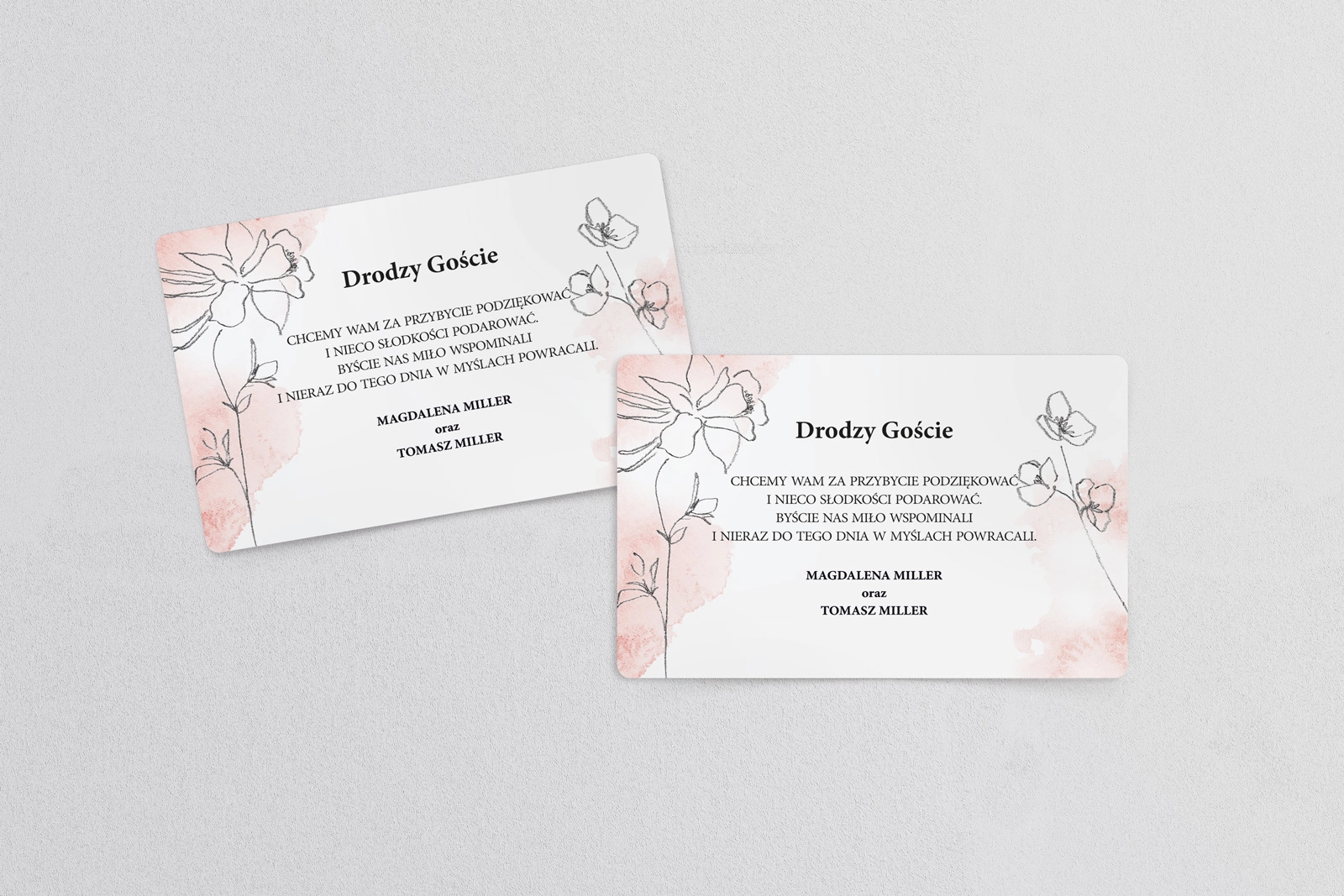 Aby otrzymać darmową personalizację ustaliliśmy minimalną ilość zamówienia na 20 szt. Jeżeli interesuje Cię zamówienie mniejszej ilości należy dodatkowo dokupić usługę Personalizacji Zaproszeń Ślubnych.