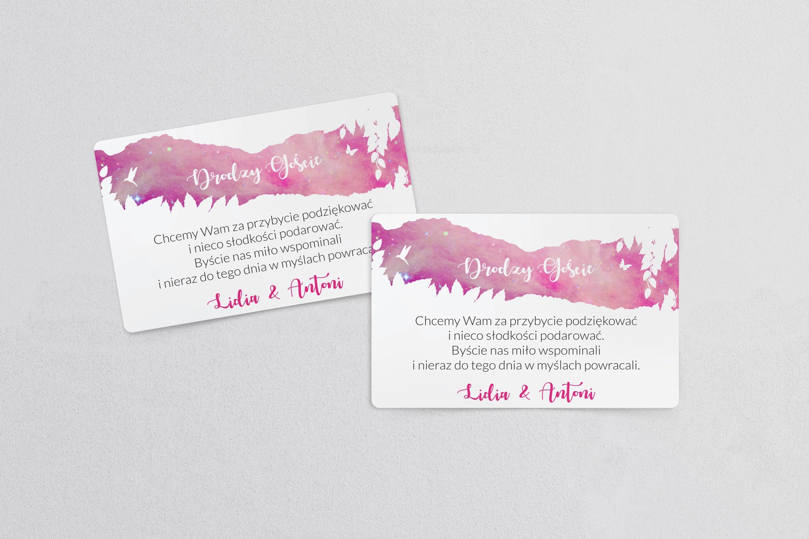 Aby otrzymać darmową personalizację ustaliliśmy minimalną ilość zamówienia na 20 szt. Jeżeli interesuje Cię zamówienie mniejszej ilości należy dodatkowo dokupić usługę Personalizacji Zaproszeń Ślubnych.