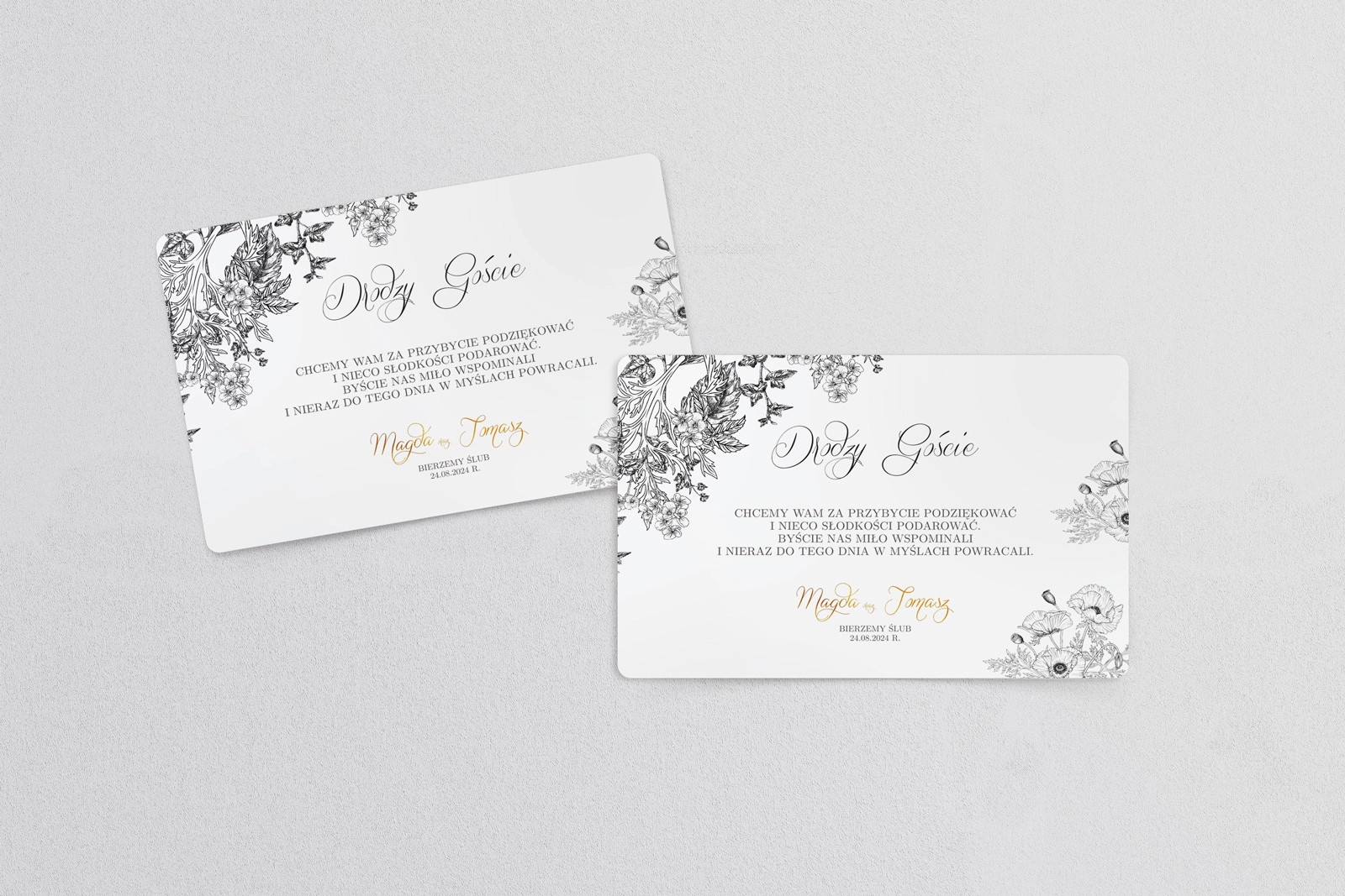 Aby otrzymać darmową personalizację ustaliliśmy minimalną ilość zamówienia na 20 szt. Jeżeli interesuje Cię zamówienie mniejszej ilości należy dodatkowo dokupić usługę Personalizacji Zaproszeń Ślubnych.