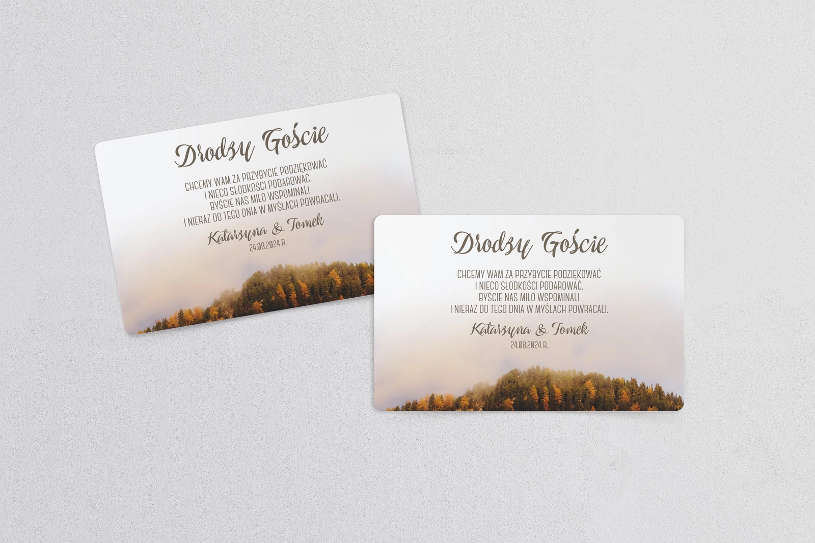 Aby otrzymać darmową personalizację ustaliliśmy minimalną ilość zamówienia na 20 szt. Jeżeli interesuje Cię zamówienie mniejszej ilości należy dodatkowo dokupić usługę Personalizacji Zaproszeń Ślubnych.