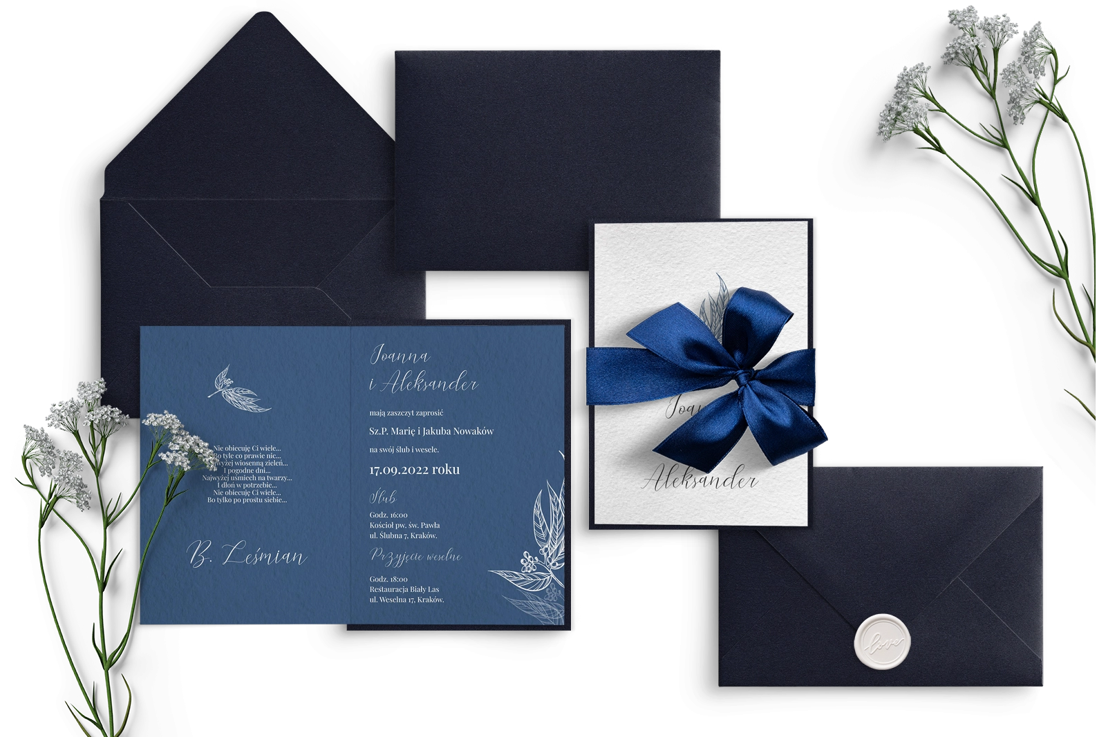 Niebieskie zaproszenie składane z kopertą granatową, podklejką i wstążką granatową