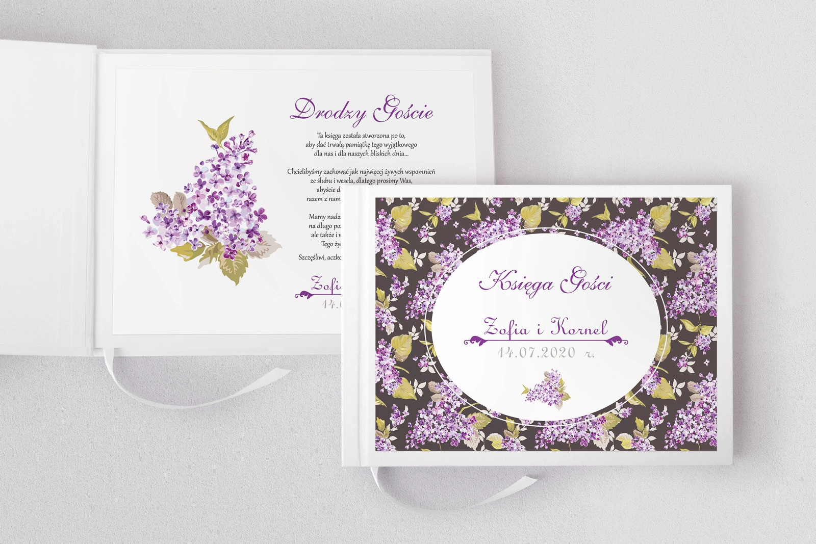 Nasza księga gości posiada 50 białych kartek w rozmiarze A4 zszytych metodą albumową. Zastosowaliśmy w niej białą okleinę o satynowym wyglądzie o fakturze delikatnej skóry. Dzięki takiemu obszyciu księga nie brudzi się i solidnie wygląda.