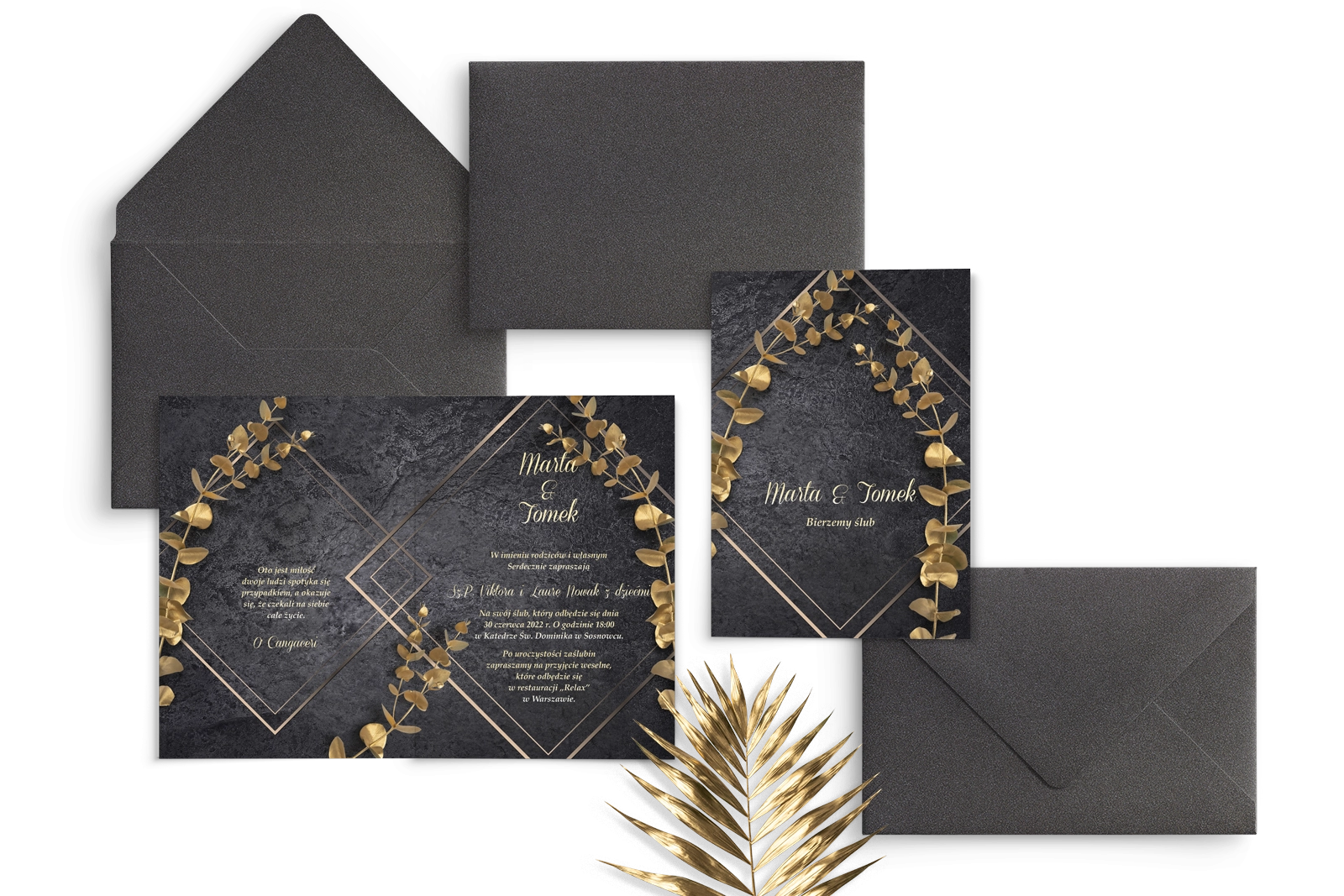 Nowoczesne Zaproszenia ślubne Złote Kwiaty z perłową grafitową kopertą