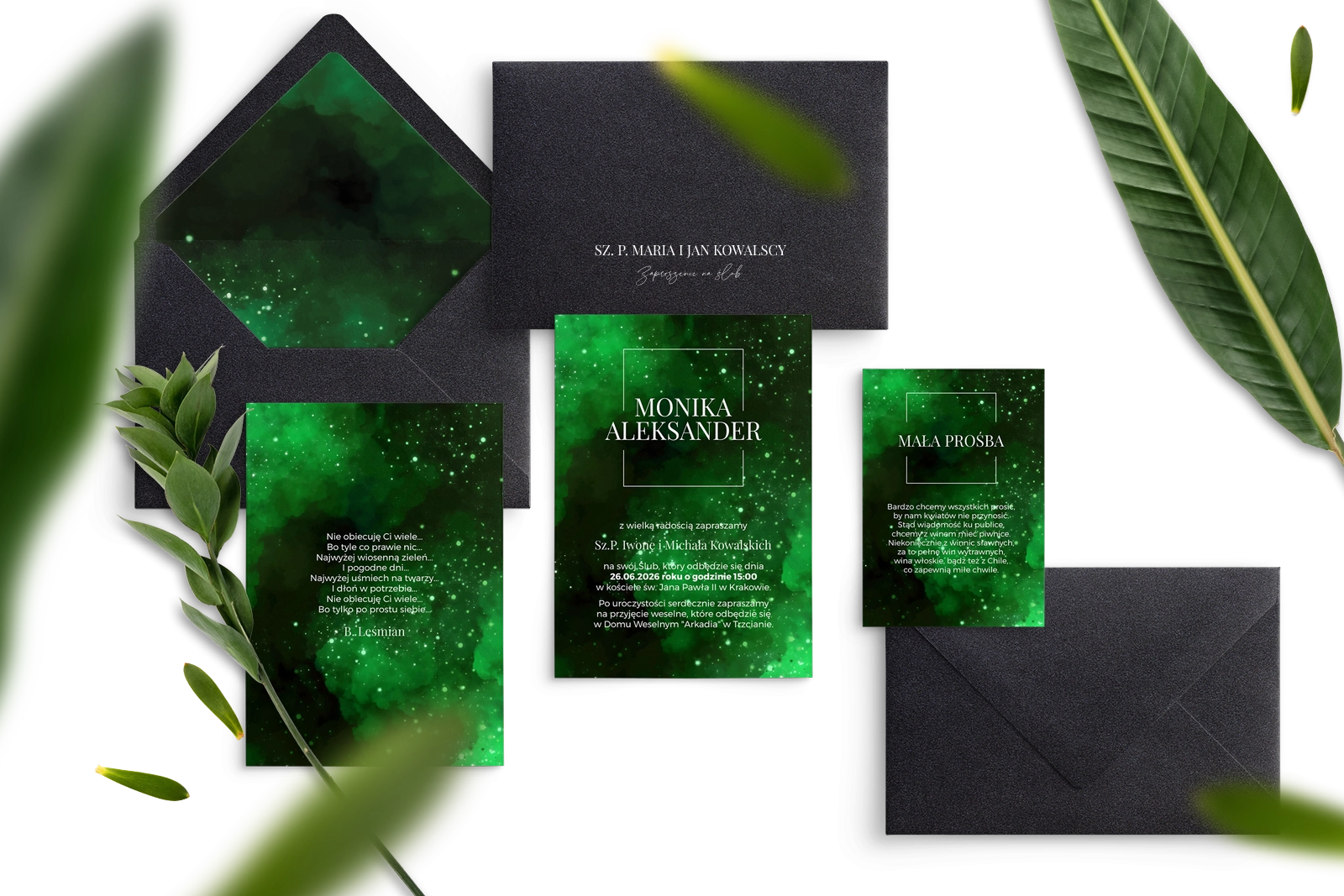 Oryginalne i nowoczesne Zaproszenia ślubne Colors of the Sky z czarną kopertą i dodatkowymi kartami