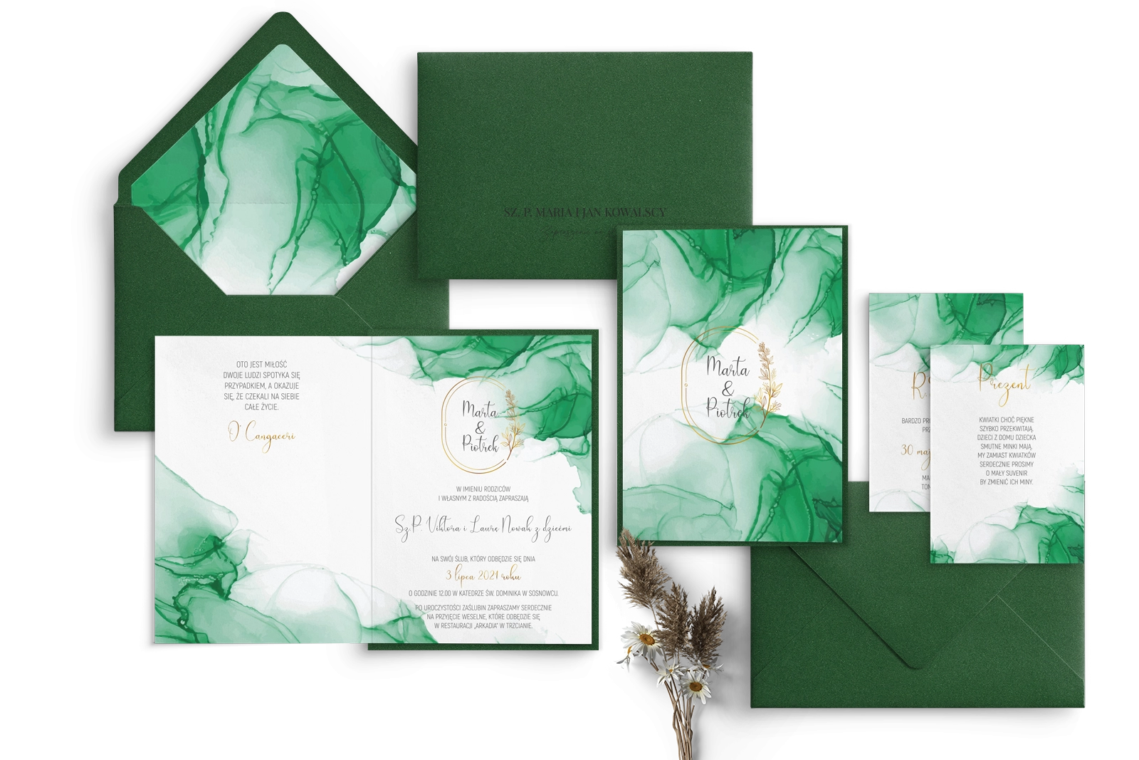 Oryginalne Zaproszenia ślubne Glamour Ink Składane z butelkowo zieloną kopertą z dodatkiem wklejki oraz butelkowo zieloną podklejką i dwiema dodatkowymi wkładkami
