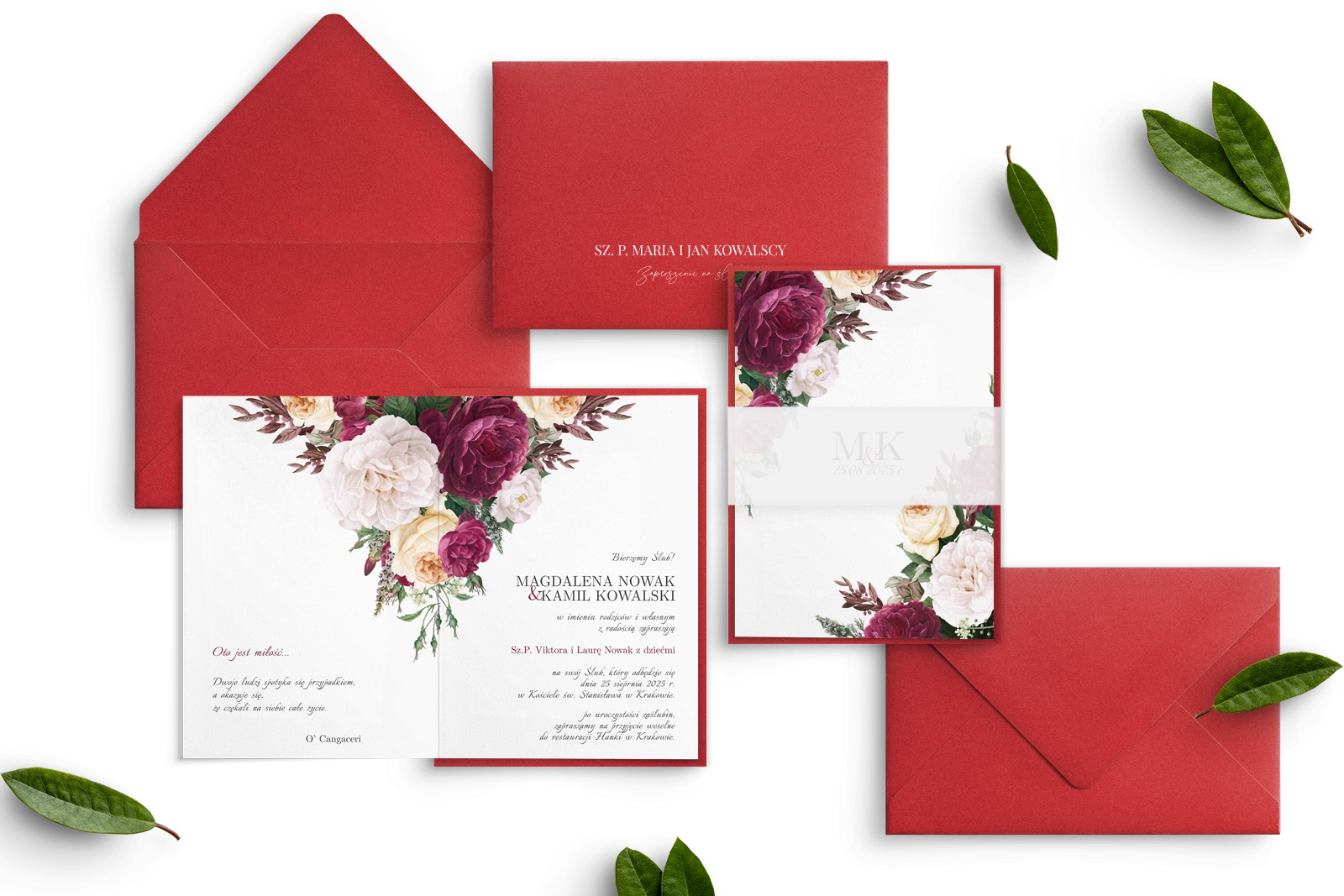 Oryginalne motywy kwiatowe zawarte na zaproszeniach dodadzą zaproszeniu romantyzmu. Mocny kolor kwiatów podkreśli elegancję a delikatna zieleń liści ożywi całe zaproszenie. Intensywne bordowe kolory w połączeniu z bielą papieru tworzą piękny efekt końcowy.