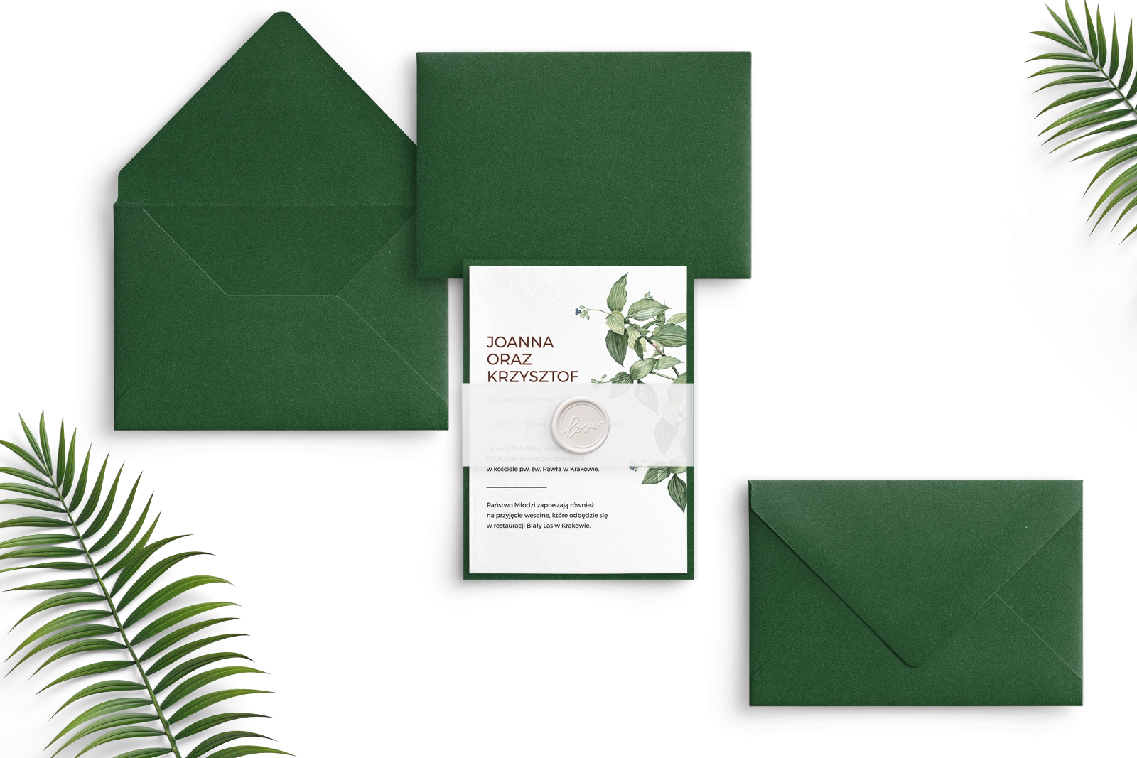 Piękne zaproszenie Meadow motyw 1 z kopertą i podklejką zieloną oraz opaską z kalki