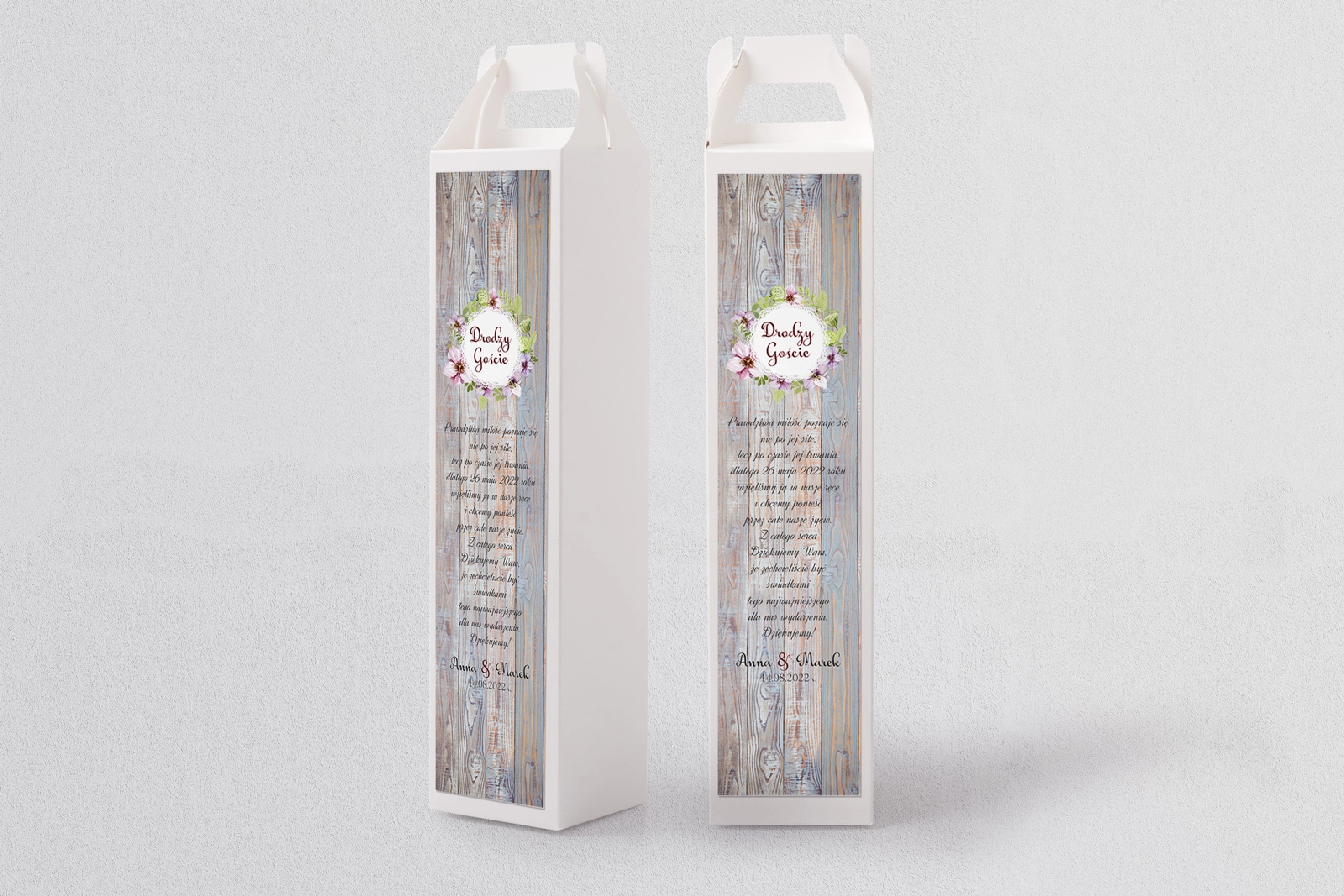 Delikatne brązowe deski a na nich namalowane rustykalne kwiaty, które idealnie przyozdobią każde pomieszczenie. Dzięki takiej szacie graficznej pudełek na alkohol Rustical, każdy będzie mógł zostawić sobie pamiątkę z Waszego najważniejszego dnia.