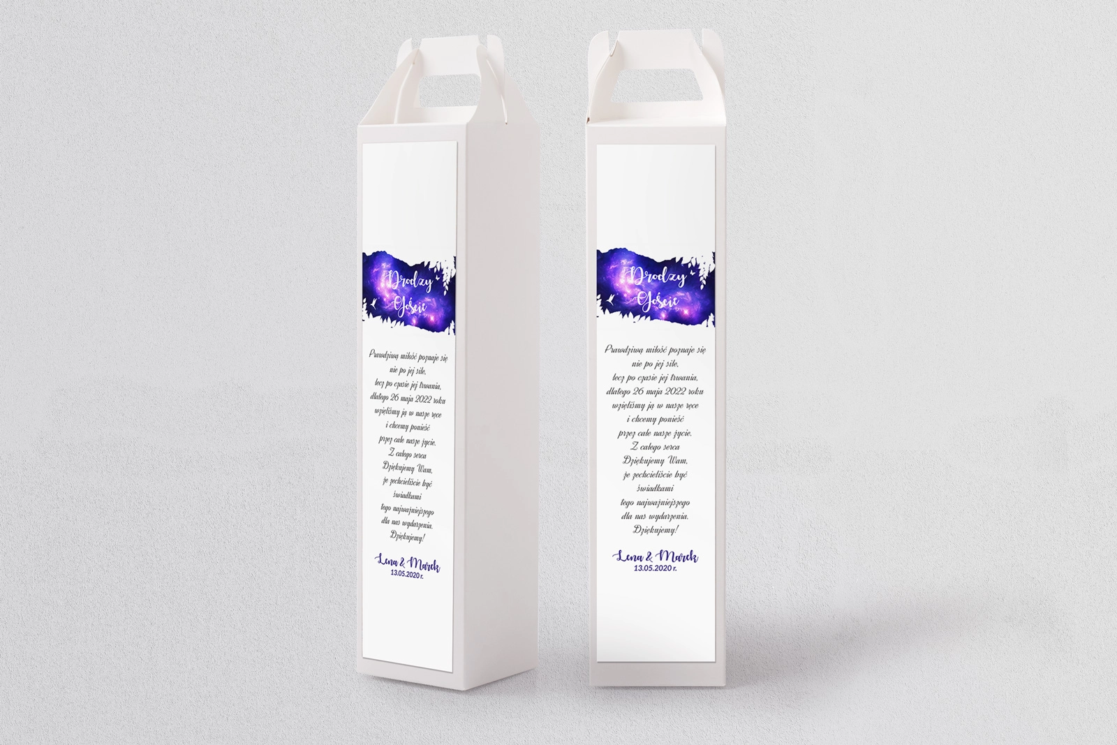 Kartonowe pudełka na alkohol Stylish pozwalają nowocześnie i pięknie podziękować gościom weselnym za przybycie. Wszystko to zawdzięczamy wspaniałej szacie graficznej, pełnej kolorów i blasku. Sprawdźcie poniżej co przygotowaliśmy, a jesteśmy przekonani, że każdy znajdzie coś idealnie dla siebie.