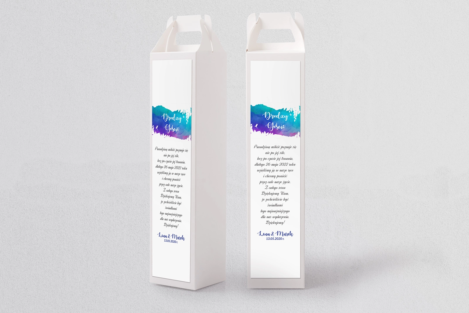 Kartonowe pudełka na alkohol Stylish pozwalają nowocześnie i pięknie podziękować gościom weselnym za przybycie. Wszystko to zawdzięczamy wspaniałej szacie graficznej, pełnej kolorów i blasku. Sprawdźcie poniżej co przygotowaliśmy, a jesteśmy przekonani, że każdy znajdzie coś idealnie dla siebie.
