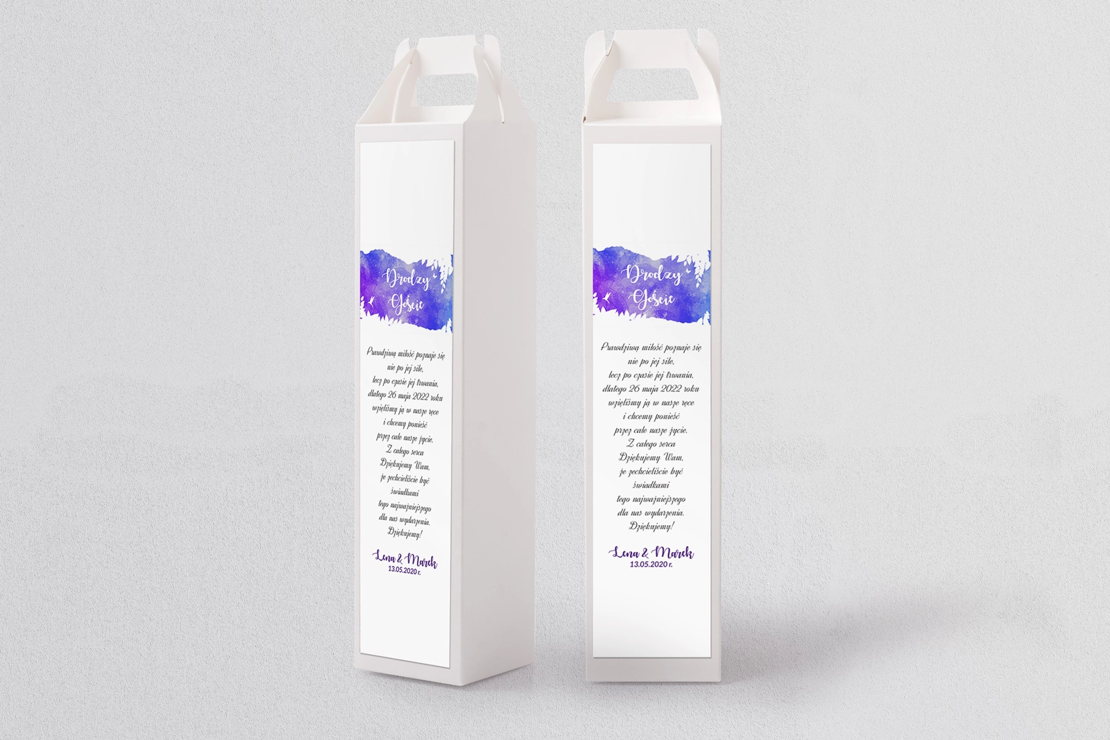 Kartonowe pudełka na alkohol Stylish pozwalają nowocześnie i pięknie podziękować gościom weselnym za przybycie. Wszystko to zawdzięczamy wspaniałej szacie graficznej, pełnej kolorów i blasku. Sprawdźcie poniżej co przygotowaliśmy, a jesteśmy przekonani, że każdy znajdzie coś idealnie dla siebie.