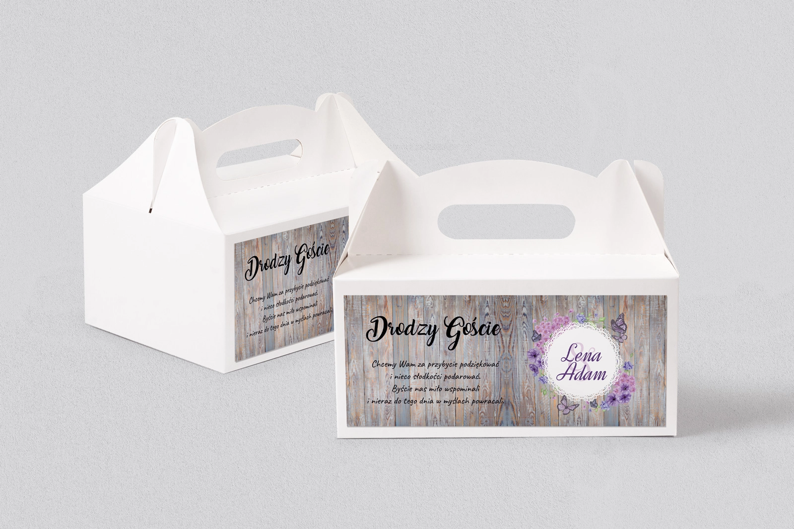 W tym sezonie zdecydowaną dominacje przejął styl rustykalny. Dlatego też powstały zaproszenia i dodatki z serii Rustical. Poniżej przedstawiamy kartonowe pudełka na ciasto, które dzięki pięknym deskom, wspaniałym rustykalnym kwiatom oraz cudownej czcionce nadaje niepowtarzalnego uroku podziękowaniom dla gości.