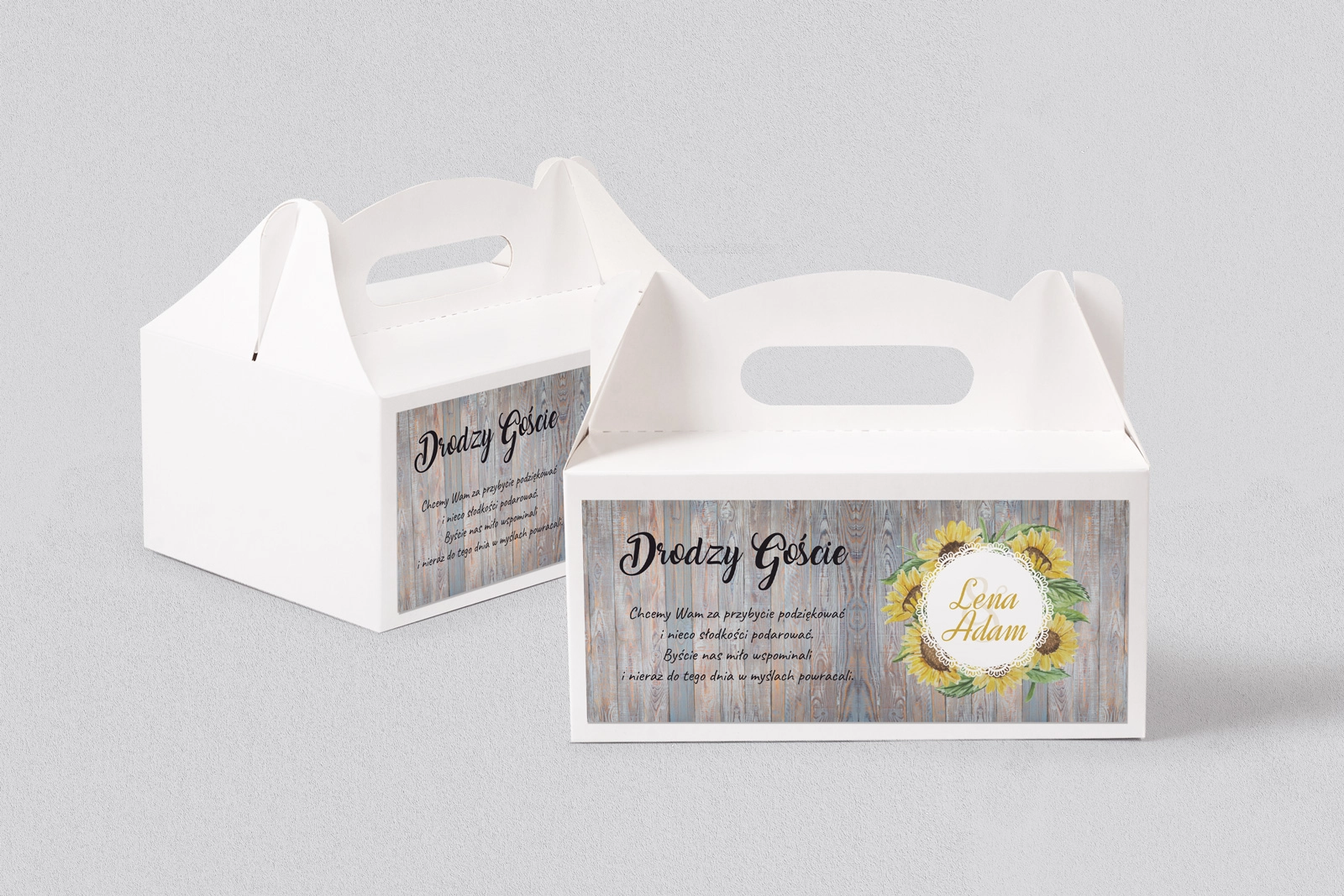 W tym sezonie zdecydowaną dominacje przejął styl rustykalny. Dlatego też powstały zaproszenia i dodatki z serii Rustical. Poniżej przedstawiamy kartonowe pudełka na ciasto, które dzięki pięknym deskom, wspaniałym rustykalnym kwiatom oraz cudownej czcionce nadaje niepowtarzalnego uroku podziękowaniom dla gości.