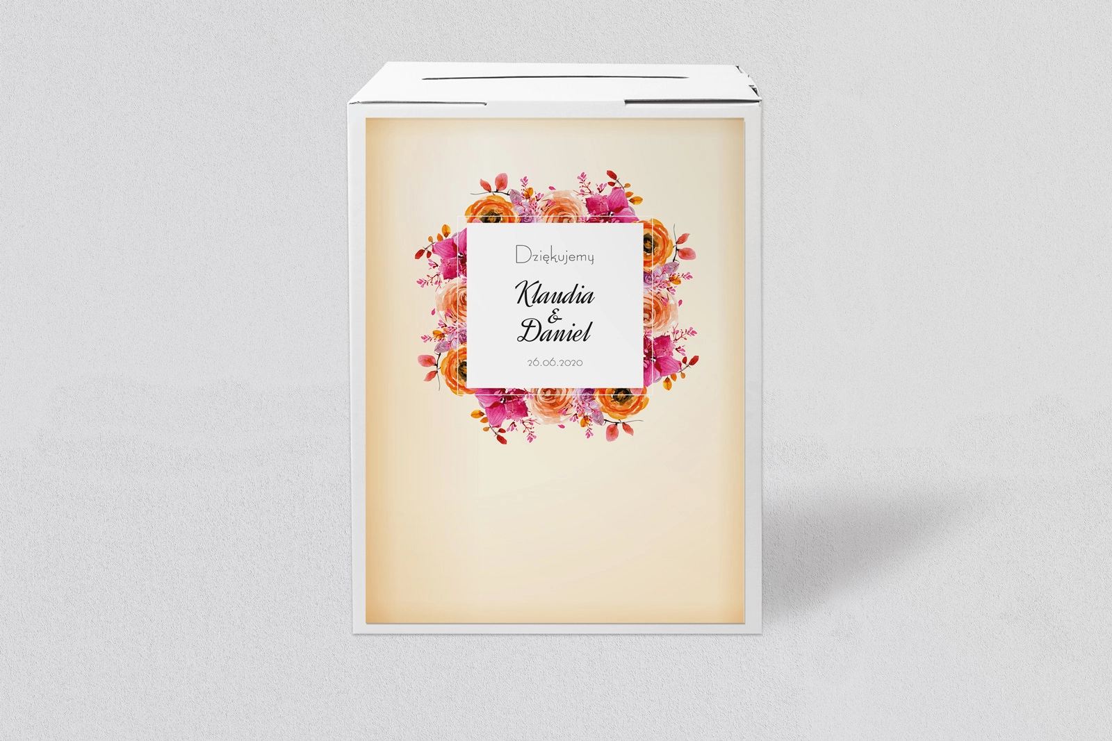 Jedno z milszych zmartwień pary młodej to zawieruszenie prezentów jednak dzięki pudełku na koperty już nikt nie musi o tym myśleć. Love to wspaniała szata graficzna, a mianowicie piękne kwiaty wyrastające zza kwadratu usadzone na piaskowym tle. Na kwadracie można spersonalizować treść według swoich potrzeb i tym samym podziękować gościom za otrzymane prezenty.