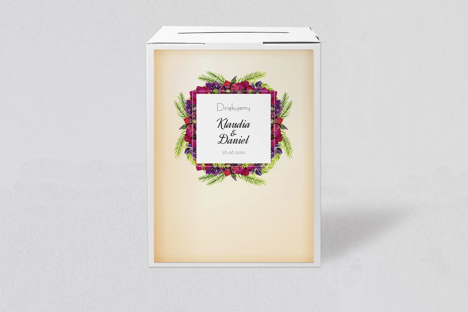 Jedno z milszych zmartwień pary młodej to zawieruszenie prezentów jednak dzięki pudełku na koperty już nikt nie musi o tym myśleć. Love to wspaniała szata graficzna, a mianowicie piękne kwiaty wyrastające zza kwadratu usadzone na piaskowym tle. Na kwadracie można spersonalizować treść według swoich potrzeb i tym samym podziękować gościom za otrzymane prezenty.