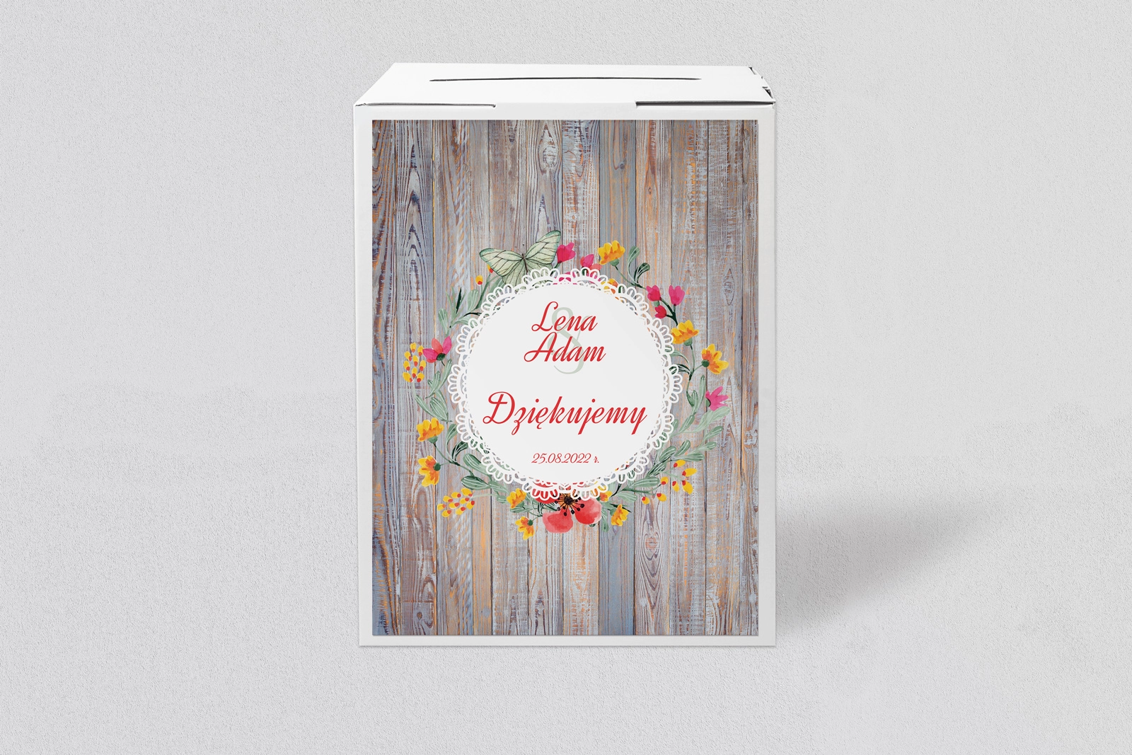 Wspaniały rustykalny styl, praktyczne zastosowanie i piękna ozdoba to są największe zalety pudełka na koperty z serii Rustical. Szata graficzna oparta jest na pięknych namalowanych kwiatach umieszczonych na brązowych deskach o żywym i naturalnym kolorze, a na nich podziękowanie wraz z Waszymi imionami wyhaftowane na pięknej serwetce.