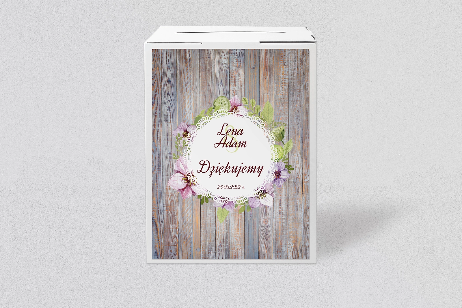 Wspaniały rustykalny styl, praktyczne zastosowanie i piękna ozdoba to są największe zalety pudełka na koperty z serii Rustical. Szata graficzna oparta jest na pięknych namalowanych kwiatach umieszczonych na brązowych deskach o żywym i naturalnym kolorze, a na nich podziękowanie wraz z Waszymi imionami wyhaftowane na pięknej serwetce.