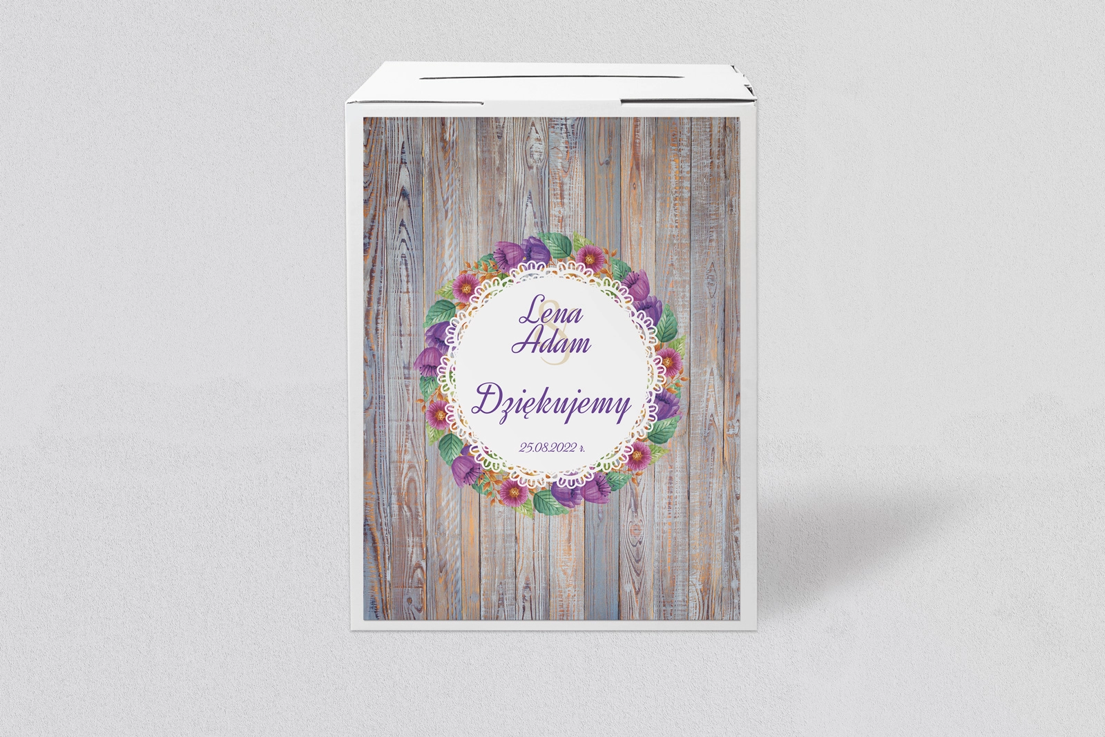 Wspaniały rustykalny styl, praktyczne zastosowanie i piękna ozdoba to są największe zalety pudełka na koperty z serii Rustical. Szata graficzna oparta jest na pięknych namalowanych kwiatach umieszczonych na brązowych deskach o żywym i naturalnym kolorze, a na nich podziękowanie wraz z Waszymi imionami wyhaftowane na pięknej serwetce.
