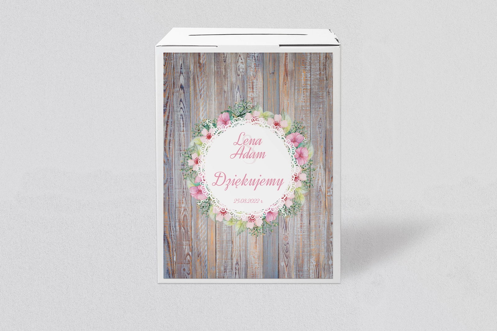 Wspaniały rustykalny styl, praktyczne zastosowanie i piękna ozdoba to są największe zalety pudełka na koperty z serii Rustical. Szata graficzna oparta jest na pięknych namalowanych kwiatach umieszczonych na brązowych deskach o żywym i naturalnym kolorze, a na nich podziękowanie wraz z Waszymi imionami wyhaftowane na pięknej serwetce.