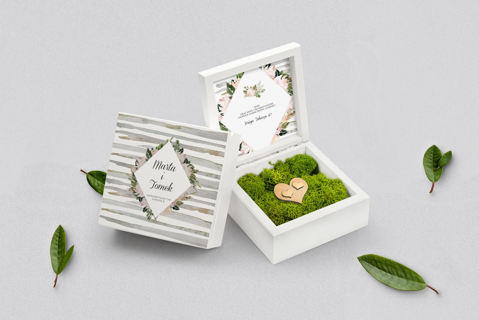 Na tej karcie produktu kupujesz Pudełka na obrączki w konfiguracji określonej w specyfikacji.