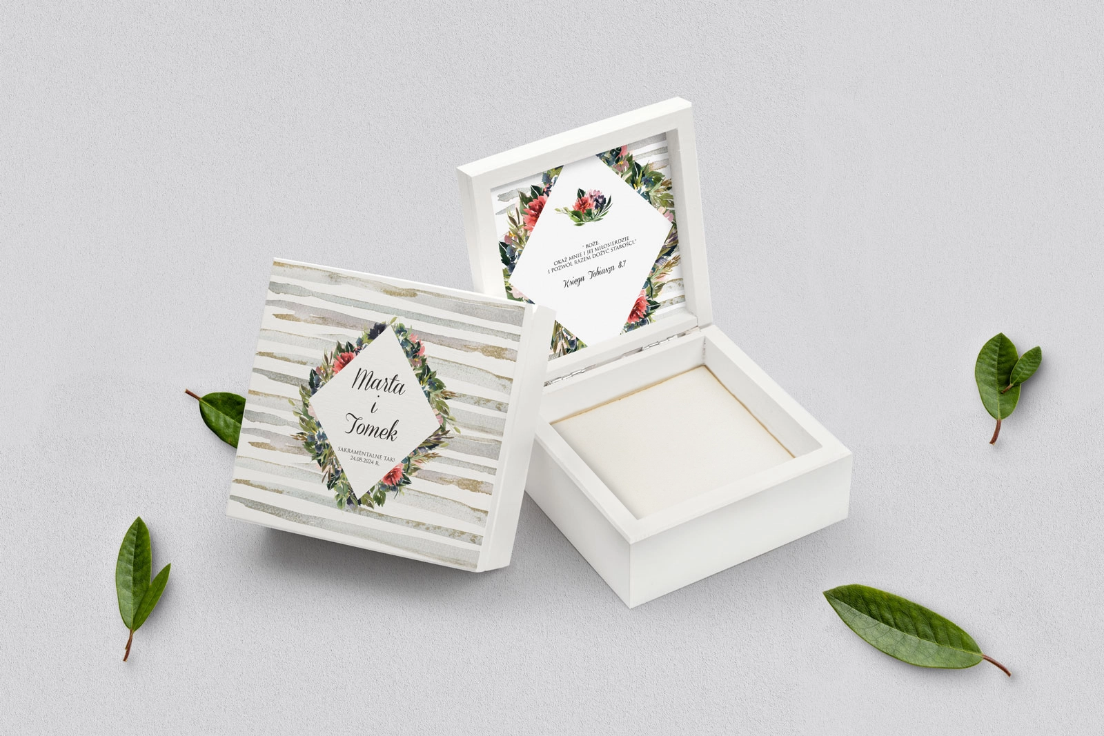 Na tej karcie produktu kupujesz Pudełka na obrączki w konfiguracji określonej w specyfikacji.
