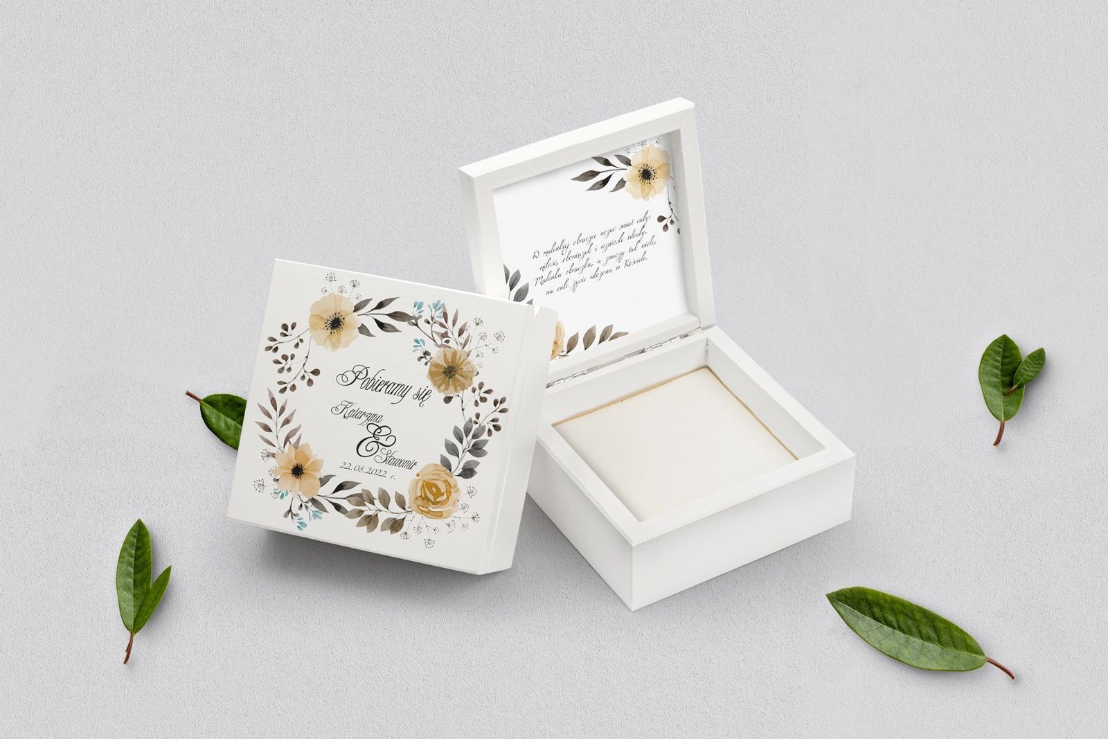 Na tej karcie produktu kupujesz Pudełka na obrączki w konfiguracji określonej w specyfikacji.