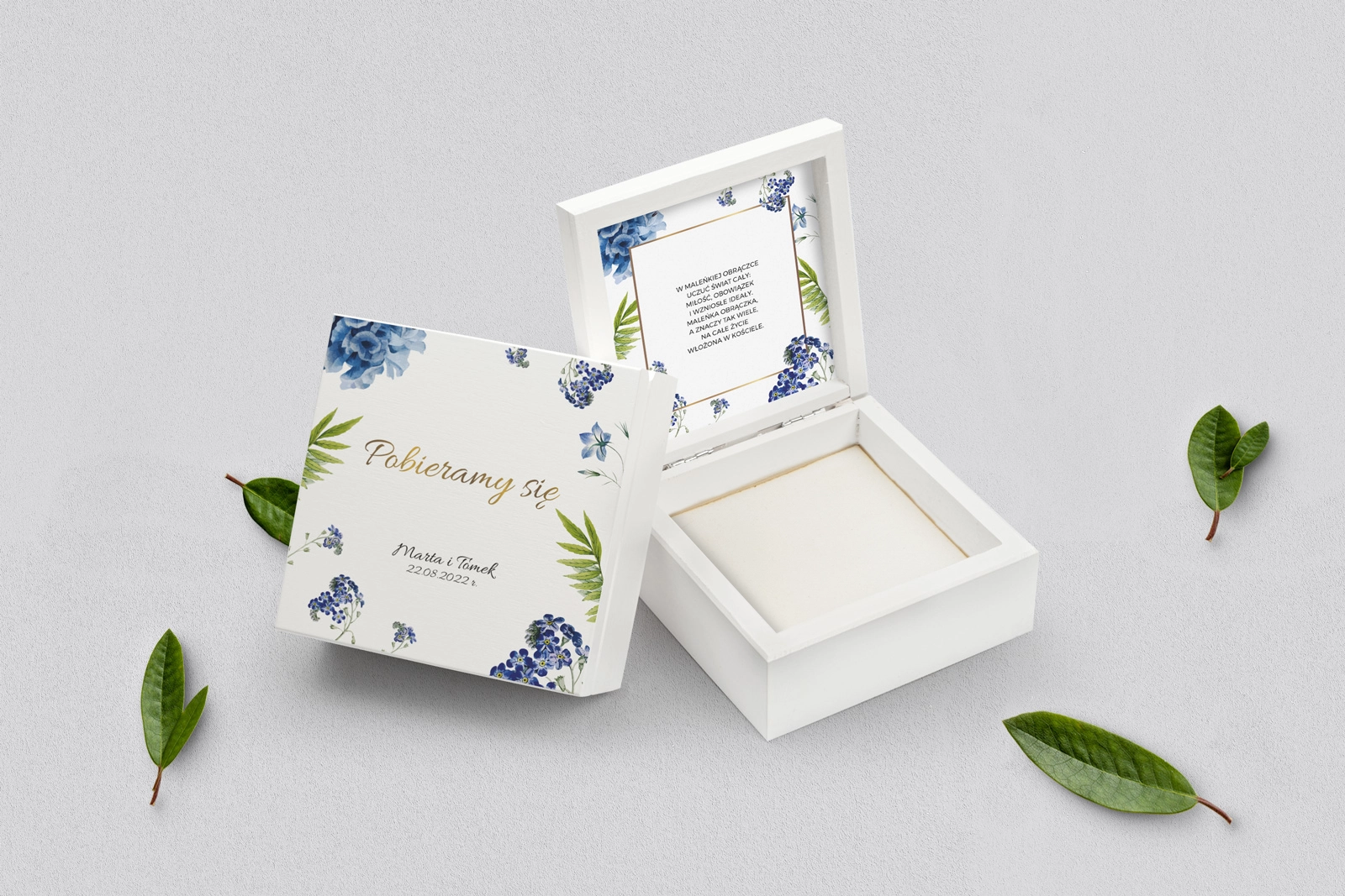 Na tej karcie produktu kupujesz Pudełka na obrączki w konfiguracji określonej w specyfikacji.
