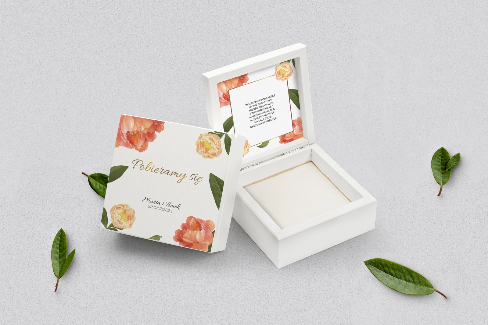 Na tej karcie produktu kupujesz Pudełka na obrączki w konfiguracji określonej w specyfikacji.