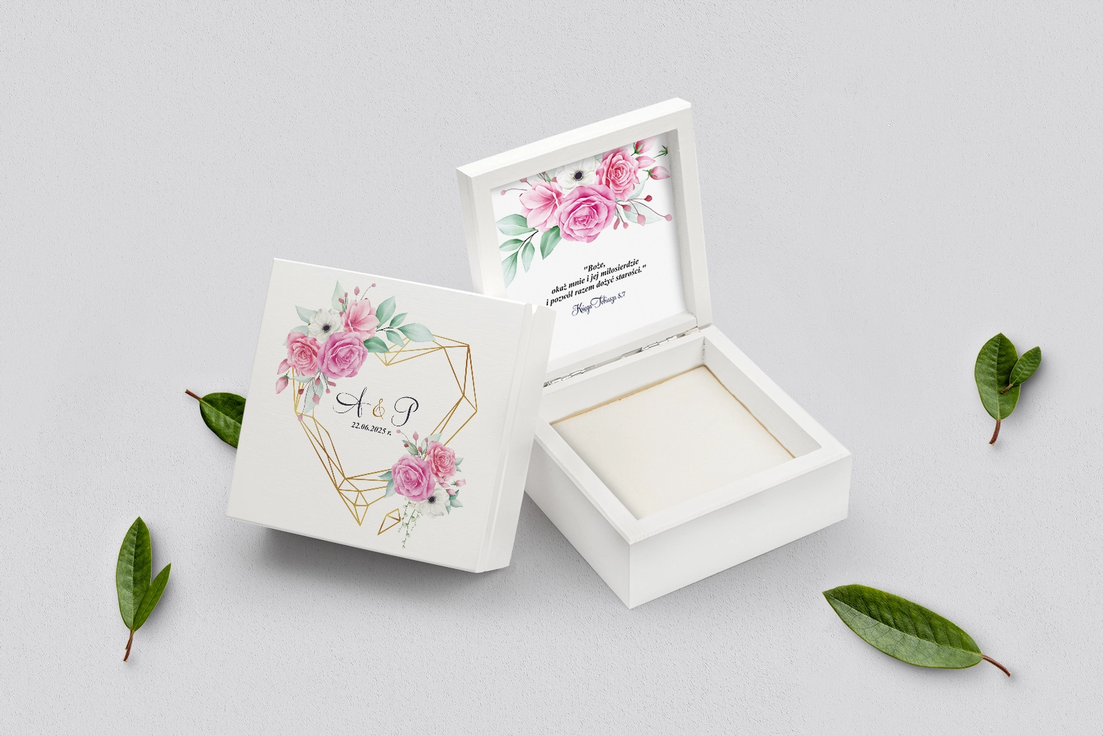 Na tej karcie produktu kupujesz Pudełka na obrączki w konfiguracji określonej w specyfikacji.