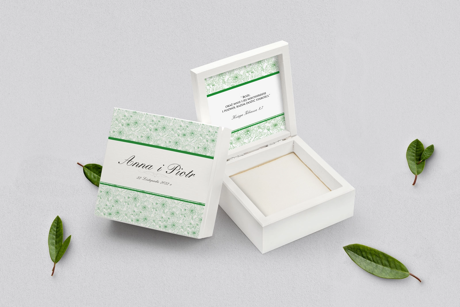 Na tej karcie produktu kupujesz Pudełka na obrączki w konfiguracji określonej w specyfikacji.