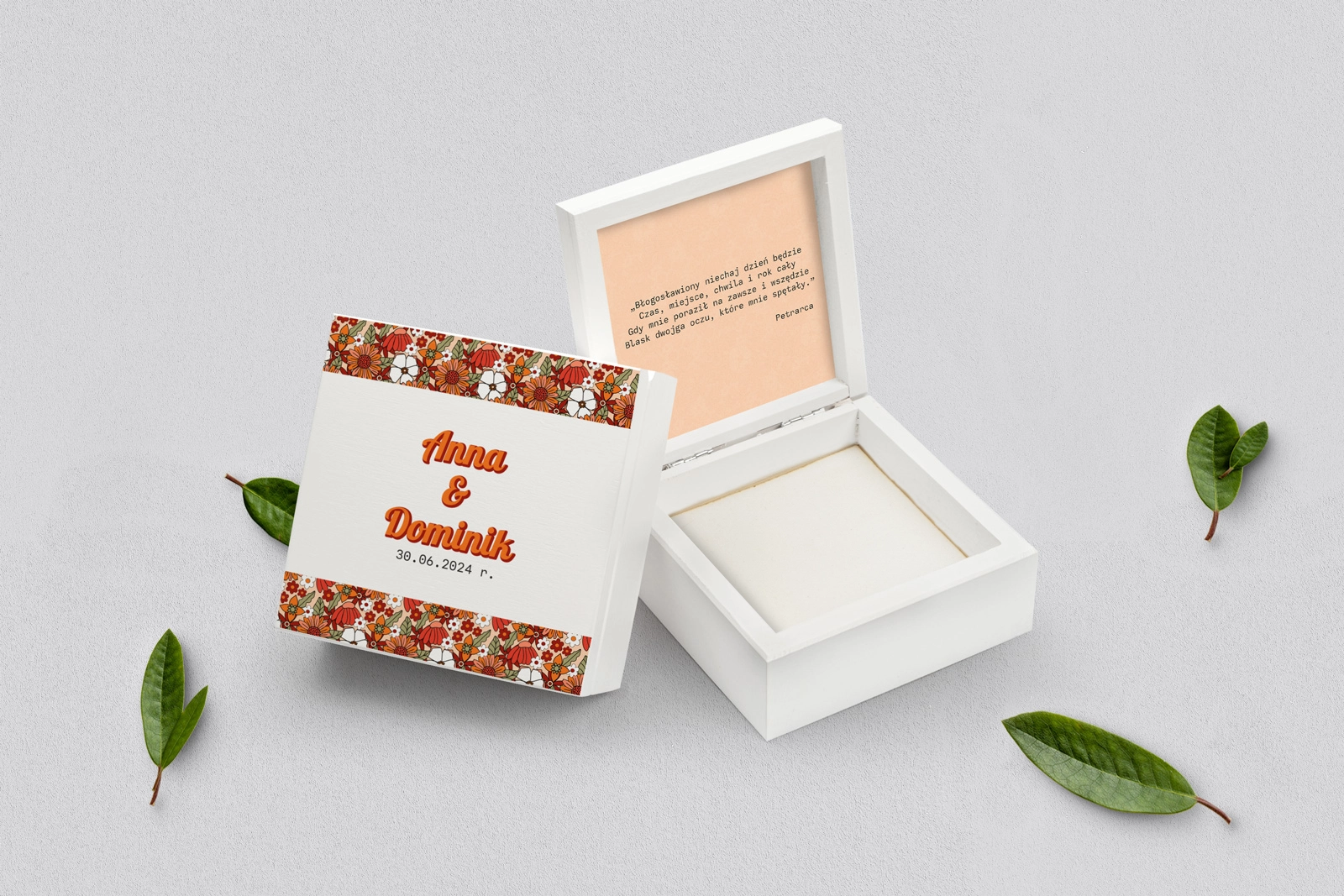 Na tej karcie produktu kupujesz Pudełka na obrączki w konfiguracji określonej w specyfikacji.