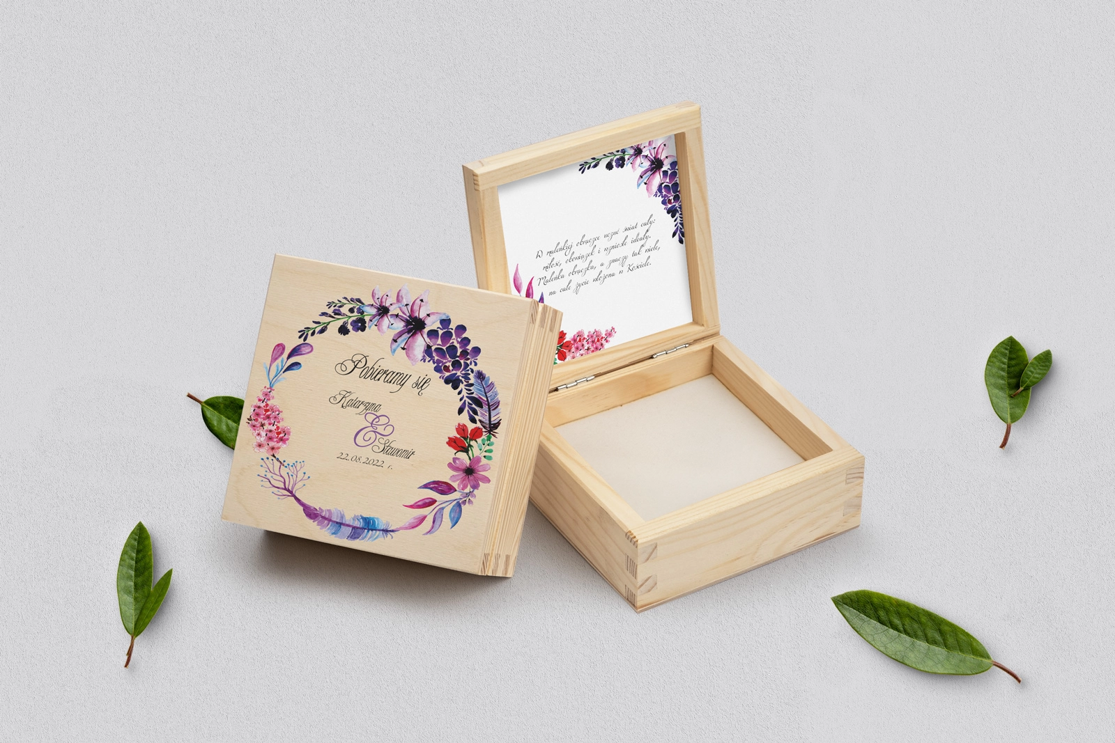 Pudełko na obrączki naturalne - Akwarelowe Wianki Motyw 7