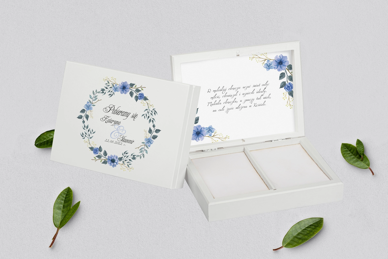 Na tej karcie produktu kupujesz Pudełka na obrączki w konfiguracji określonej w specyfikacji.