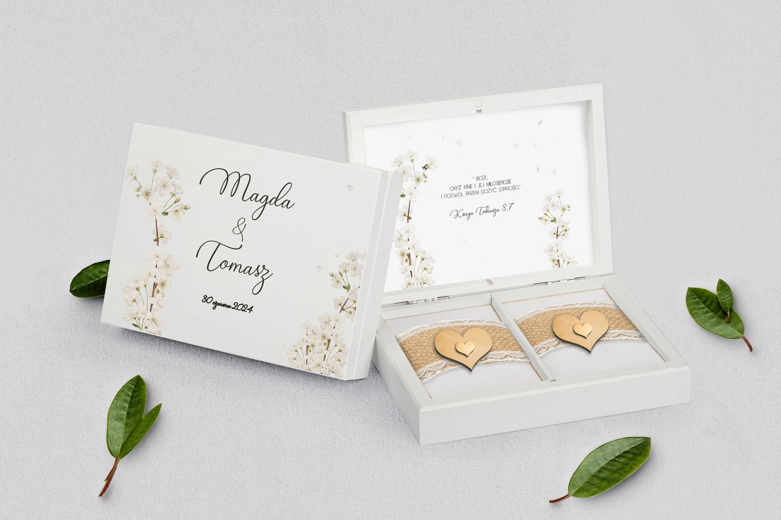 Na tej karcie produktu kupujesz Pudełka na obrączki w konfiguracji określonej w specyfikacji.