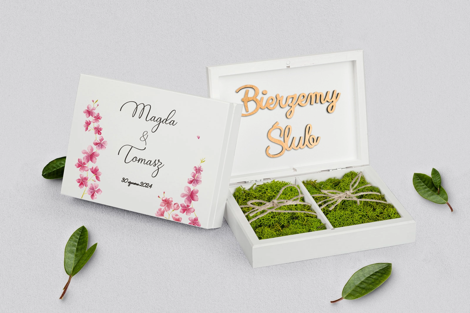 Na tej karcie produktu kupujesz Pudełka na obrączki w konfiguracji określonej w specyfikacji.