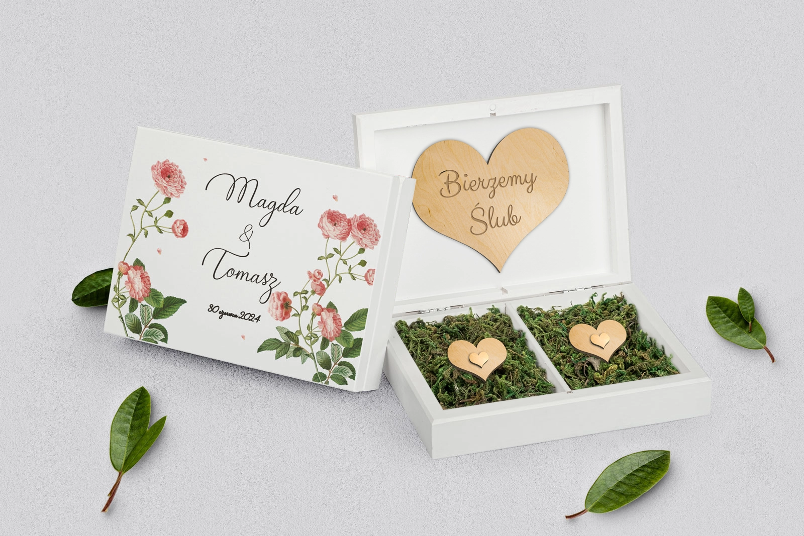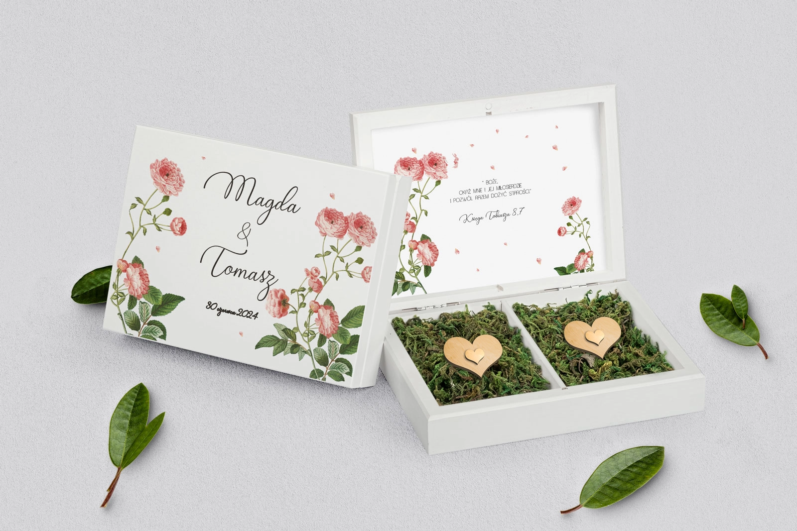 Na tej karcie produktu kupujesz Pudełka na obrączki w konfiguracji określonej w specyfikacji.