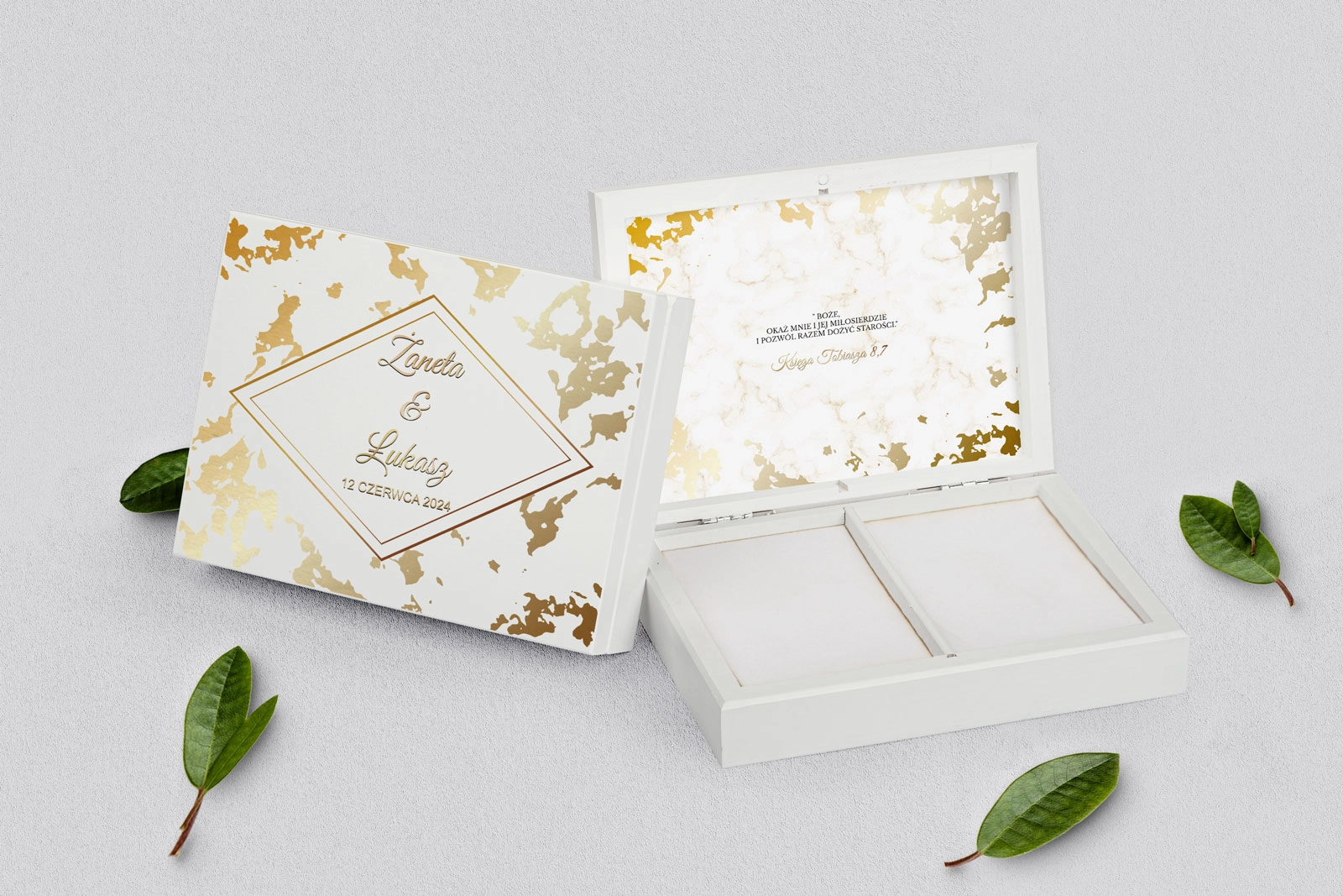Pudełko na obrączki prostokątne białe - Marmur i Złoto Motyw 5