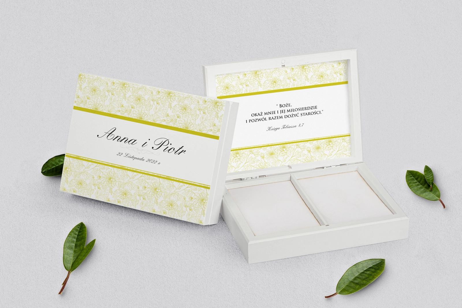 Na tej karcie produktu kupujesz Pudełka na obrączki w konfiguracji określonej w specyfikacji.