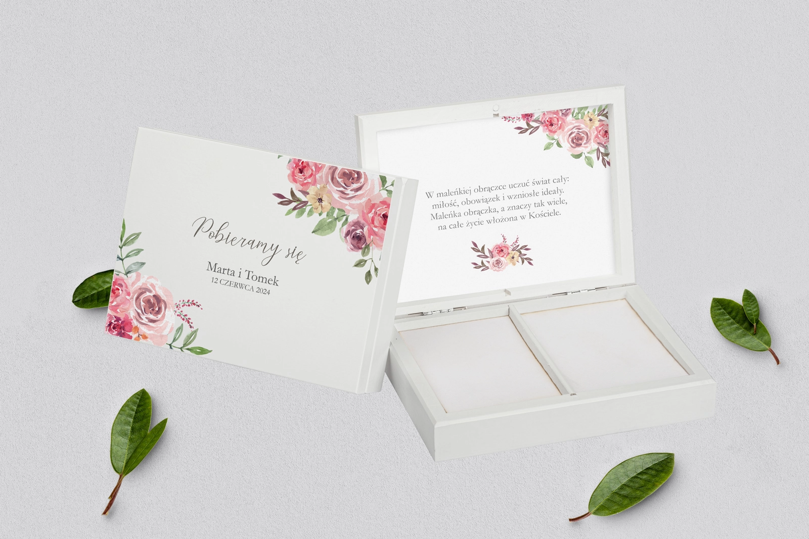 Na tej karcie produktu kupujesz Pudełka na obrączki w konfiguracji określonej w specyfikacji.