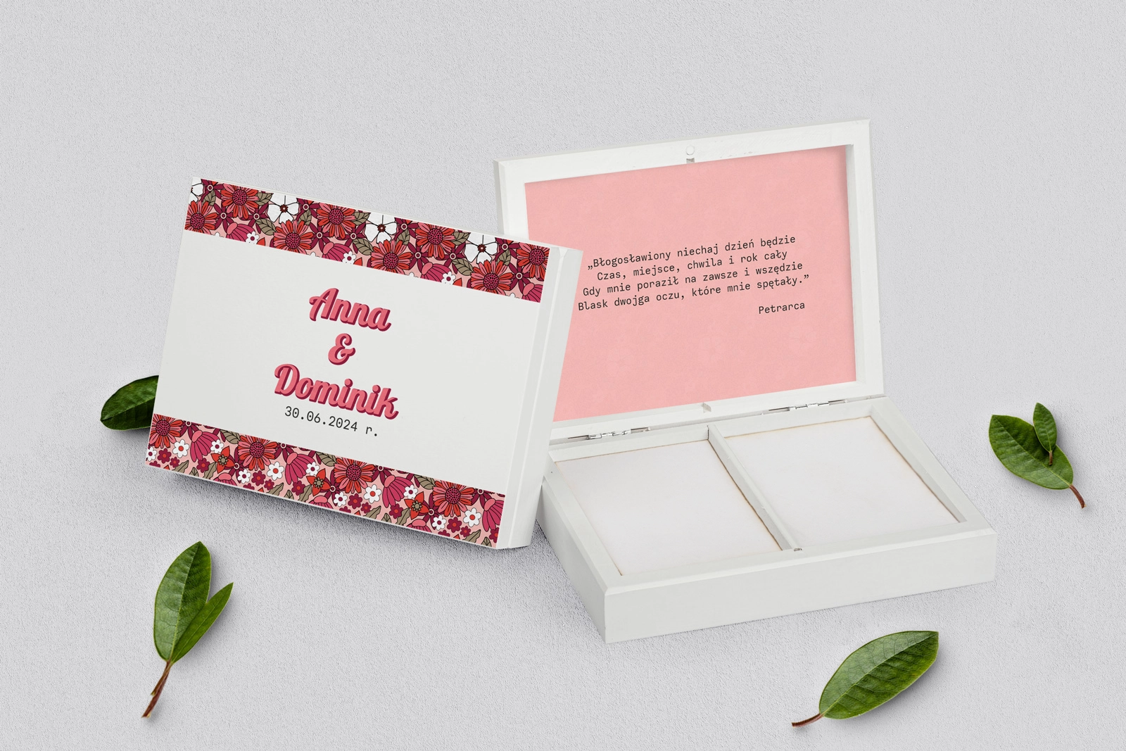 Na tej karcie produktu kupujesz Pudełka na obrączki w konfiguracji określonej w specyfikacji.