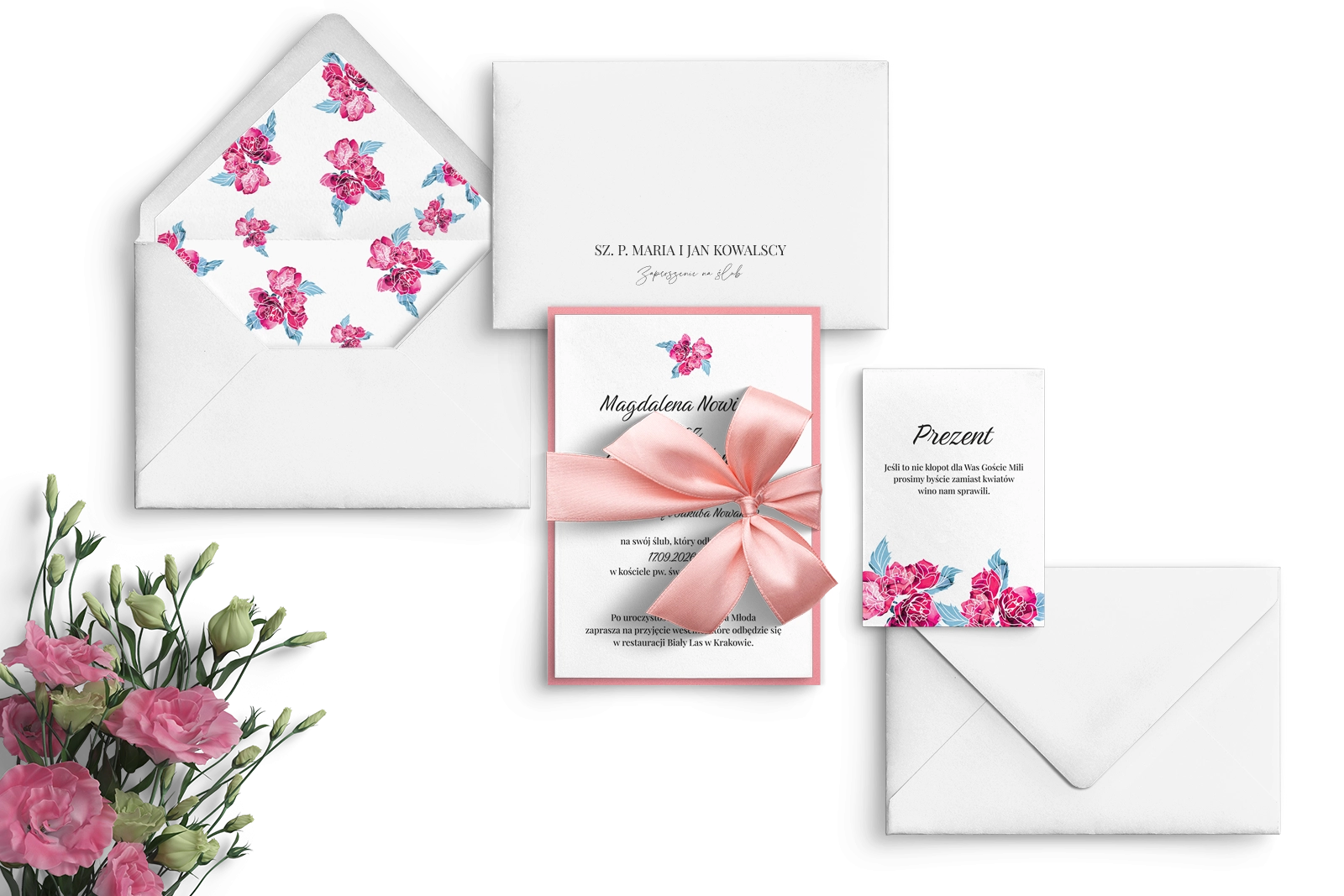 Romantyczne Zaproszenia ślubne Nature's Kiss z różową kokardą, kopertą oraz dodatkową wkładką