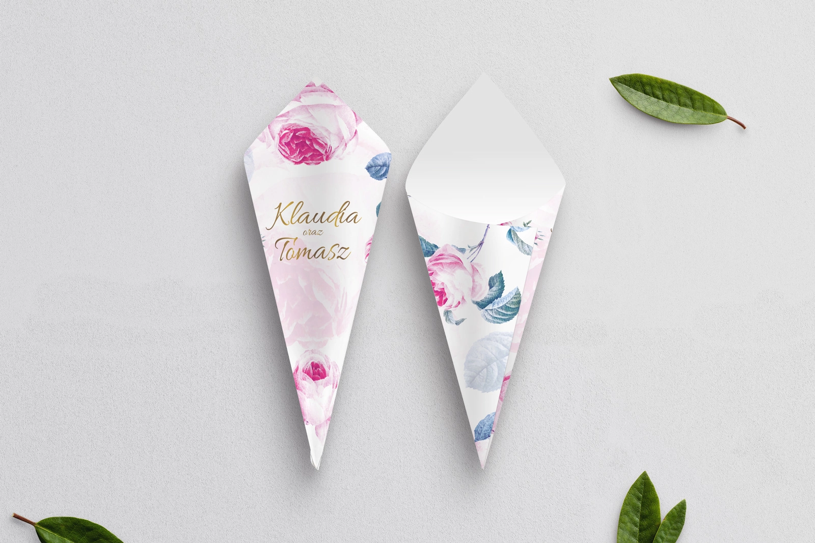 Rożek weselny pełni rolę pięknego pojemnika na płatki róż, słodycze, popcorn itp.