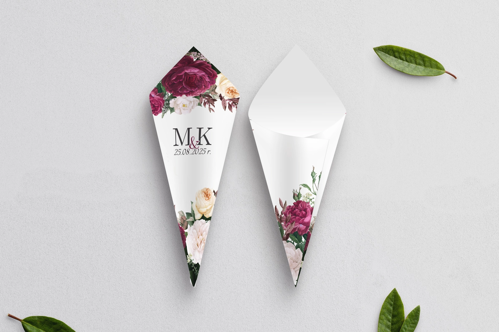 Rożek weselny pełni rolę pięknego pojemnika na płatki róż, słodycze, popcorn itp.