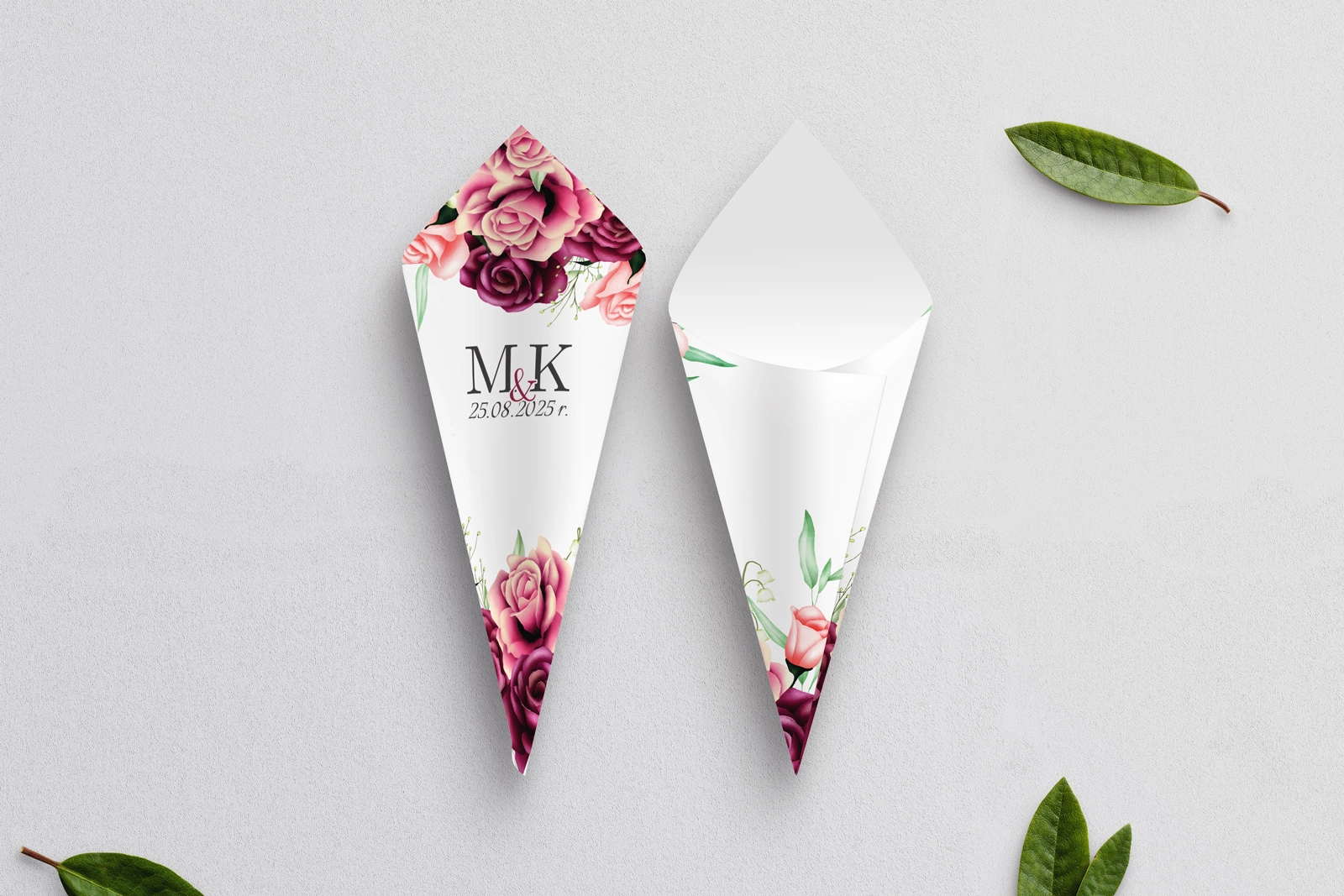 Rożek weselny pełni rolę pięknego pojemnika na płatki róż, słodycze, popcorn itp.