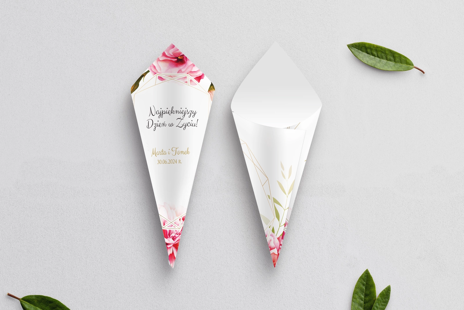 Rożek weselny pełni rolę pięknego pojemnika na płatki róż, słodycze, popcorn itp.