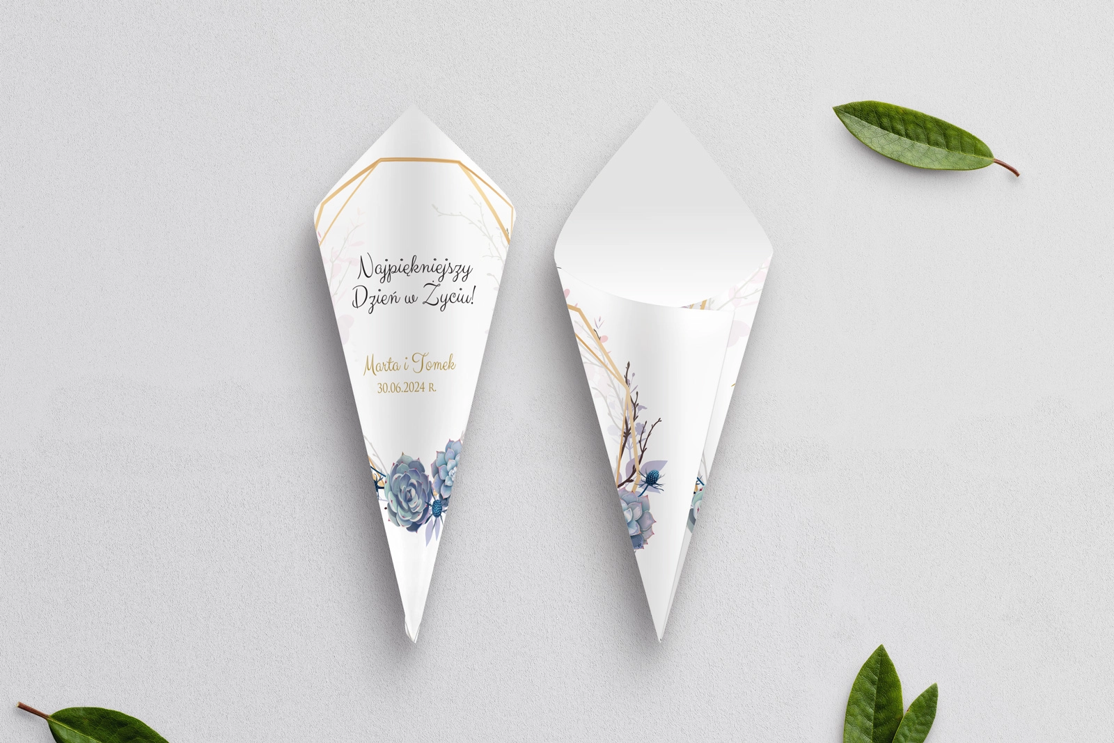 Rożek weselny pełni rolę pięknego pojemnika na płatki róż, słodycze, popcorn itp.