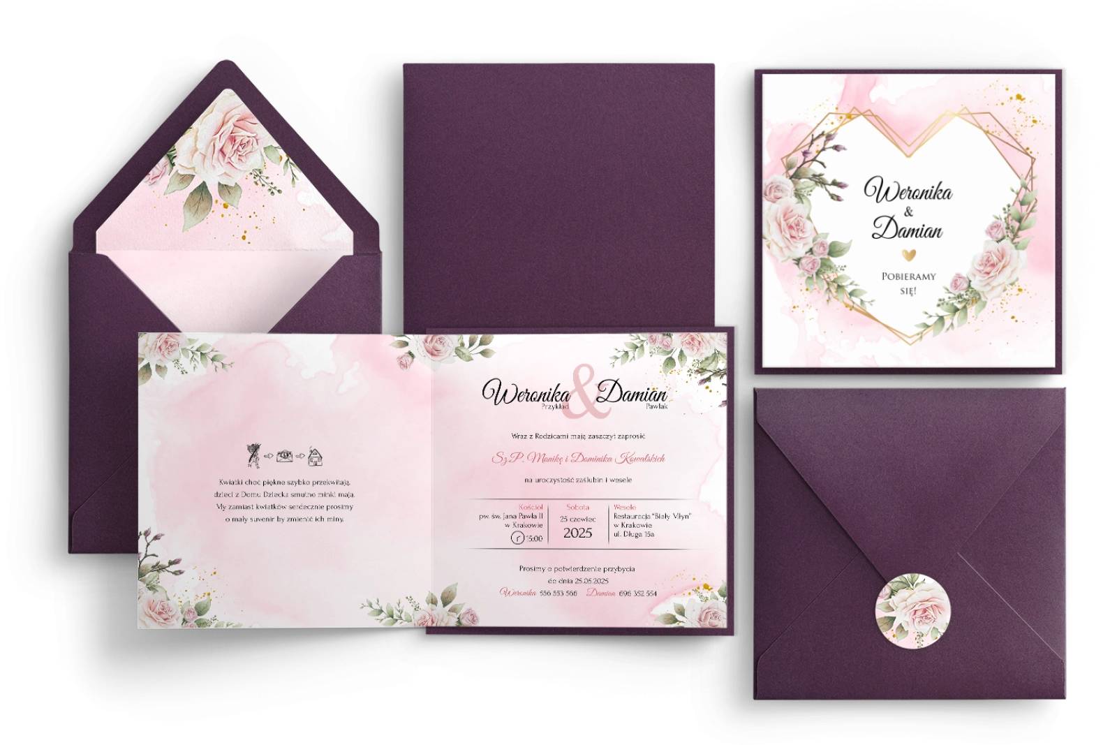 Na tej karcie produktu kupujesz Zaproszenia Ślubne Składane Kwadratowe w konfiguracji określonej w specyfikacji. Nasze zaproszenia ślubne są drukowane na wybranym przez Ciebie papierze przy użyciu wysokiej jakości drukarki produkcyjnej, która zapewnia mocne, nasycone kolory oraz czytelny wyrazisty tekst.