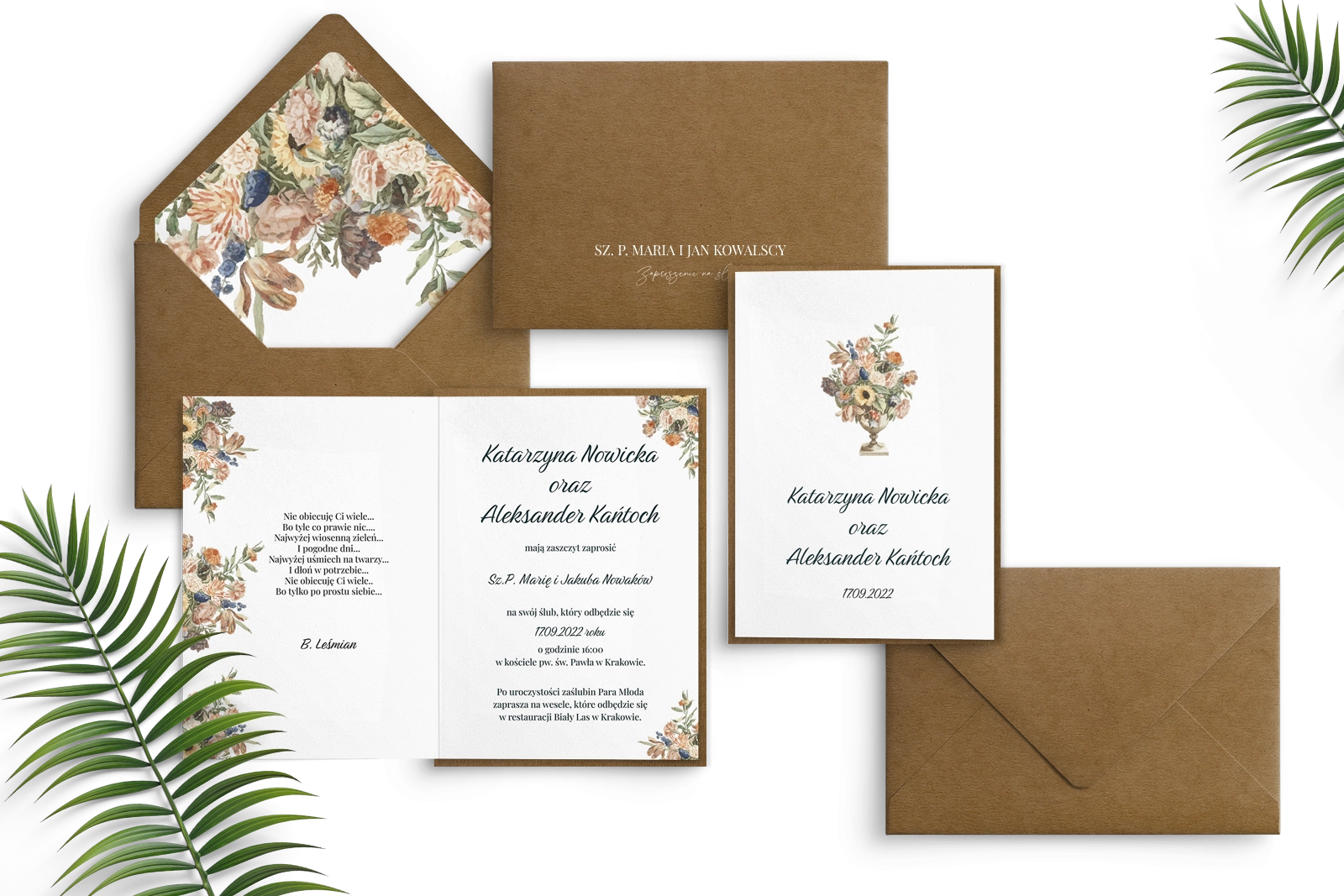 Próbka zawiera wybrany wzór zaproszenia, podklejkę oraz dodatki zgodne z konfiguracją. Rodzaj papieru dobierany jest losowo. Jeśli zamówienie obejmuje dodatki ślubne, ich wzory również są losowe, aby pokazać różnorodność oferty. Do każdej próbki dołączamy próbniki papierów, by ułatwić wybór i upewnić się, że spełnią one Twoje oczekiwania.